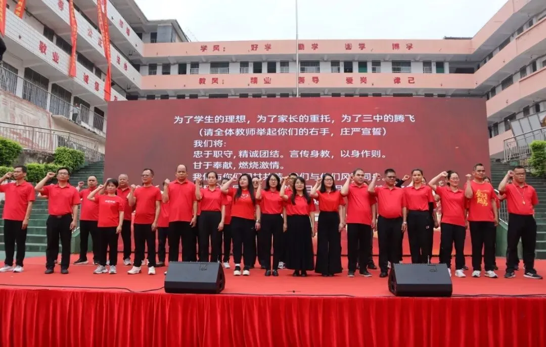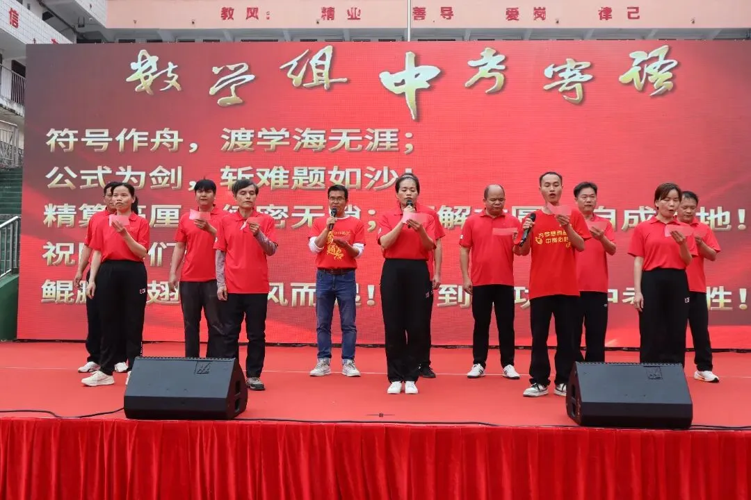 在邹大智副校长的带领下,全体九年级教师整齐列队于发言台前,面向全体学生庄严宣誓。老师们高举右拳,誓言铿锵,承诺将精诚团结,全力以赴,做学生最坚强的后盾,为学子们的百日冲刺全程保驾护航。这誓言,是责任,是担当,更是全体教师对学生的庄严承诺。