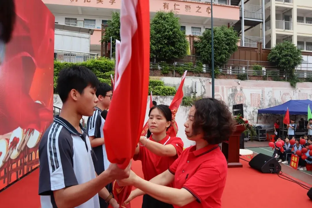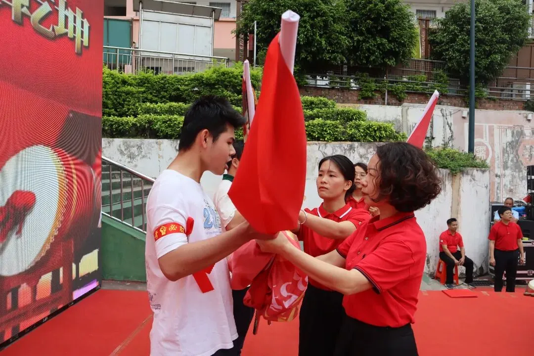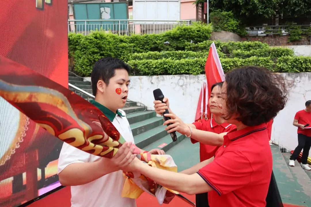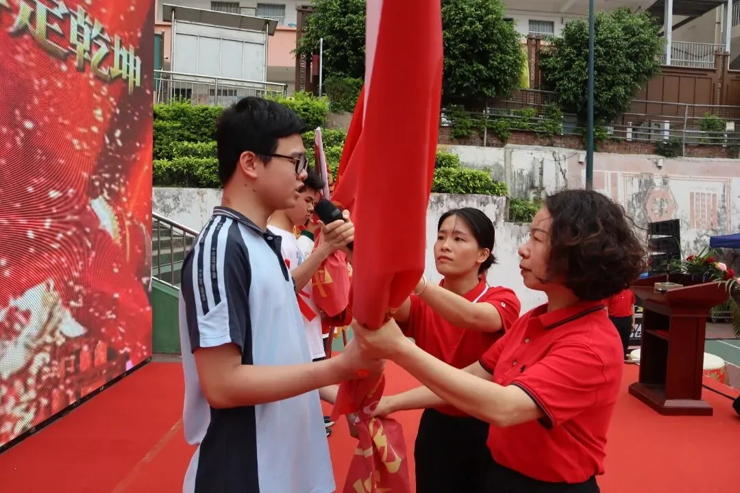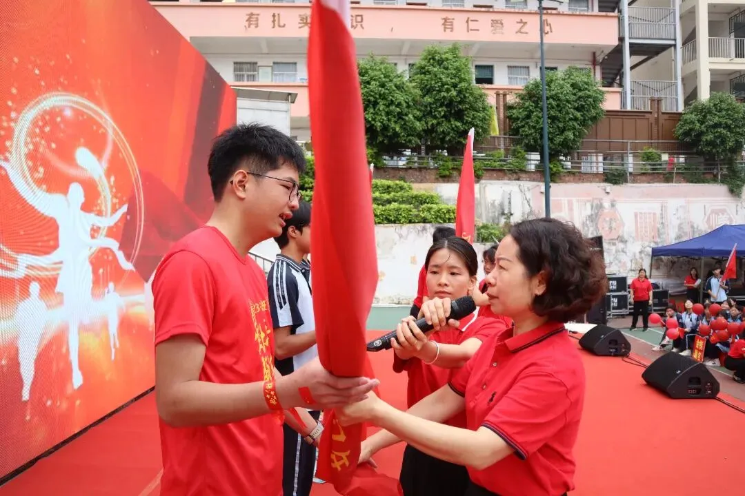 大会进入激动人心的授旗环节。李玲书记庄重地将一面面印有班级番号的战旗授予各毕业班旗手。旗手们肃立接旗,并响亮回应:“我班领命,保证完成任务!”随后,旗手们挥舞战旗,带领本班同学喊出独具特色的中考口号。旗帜挥舞,口号震天,彰显了各班的凝聚力与必胜信念。