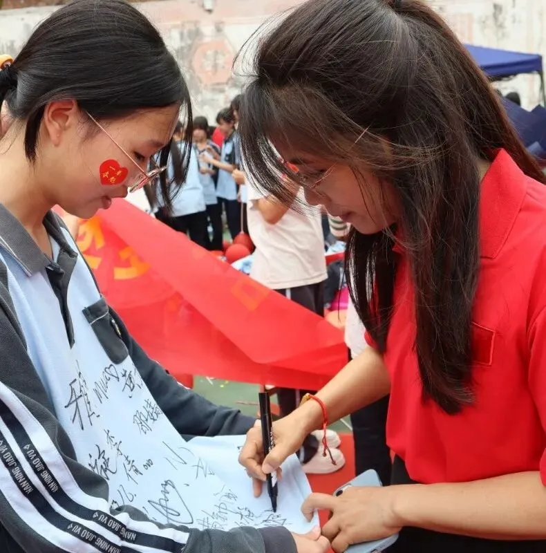 九年级学生依次登上舞台,在本班的战旗上郑重签下自己的名字。一笔一划,书写的是承诺,铭刻的是决心。这面签满姓名的班旗,将成为他们共同奋斗、追逐梦想的珍贵见证。