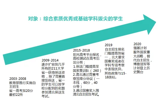 从2003起,历经了【自主招生】、【保送】、【竞赛降分】等阶段,2020年强基计划代替自主招生登上历史舞台。如今,强基计划每年持续增加名额,已经是进入顶尖学府,甚至清北的有效路径。