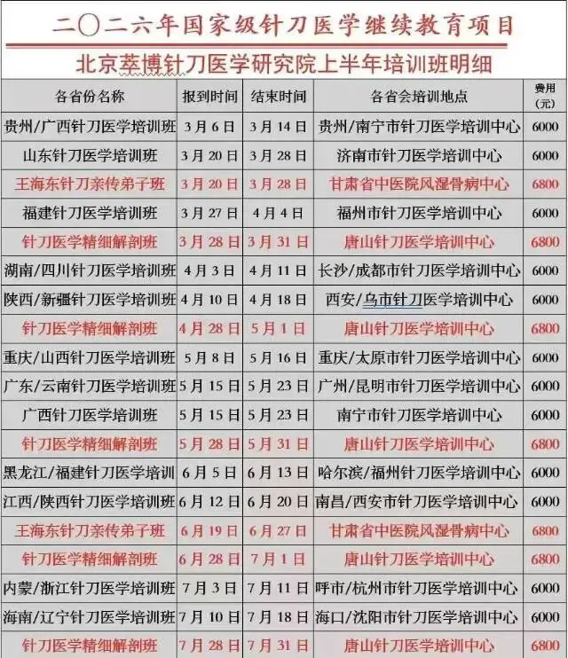 为响应国家中医药管理局关于推广及普及中医专业实用技能的通知,为了规范针刀医学临床诊疗技术,普及推广针刀医学治疗实用技能,同时交流各地针刀医学临床诊疗先进经验。北京萃博针刀医学研究院主办,北京王九针刀医学研究院承办“全国第三十一届针刀医学新进展培训班” ,将定于2026年5月16日-23日在南宁市举办,届时将邀请全国知名针刀医学专家授课,欢迎贵单位组织相关人员参加。【培训对象】凡从事骨科、风湿科、疼痛科、针灸推拿科、针刀、软伤科、麻醉科、康复理疗科、内科等各级医院、门诊、诊所的临床医生均可报名参加。1.学员结业后由北京萃博针刀医学研究院颁发结业证。2.办理证书:请带1寸彩照2张,身份证复印件一份。【培训时间】2026年5月16日—5月23日 (5月15日报到)【相关费用】6000元 一次交费终身免费复训 (包括培训注册费、培训费、资料费、临床见习、手术观摩等费用。培训期间食宿由会务组统一安排(也可自行安排)费用需自理【联 系 人】 杨老师 18539255392(微信)【报名办法】请及时填写报名回执表并传真或发电子邮件至组委会,我们将根据回执情况提前半月向您寄发培训报到须知,告知详细的培训日程安排及其他具体事宜。