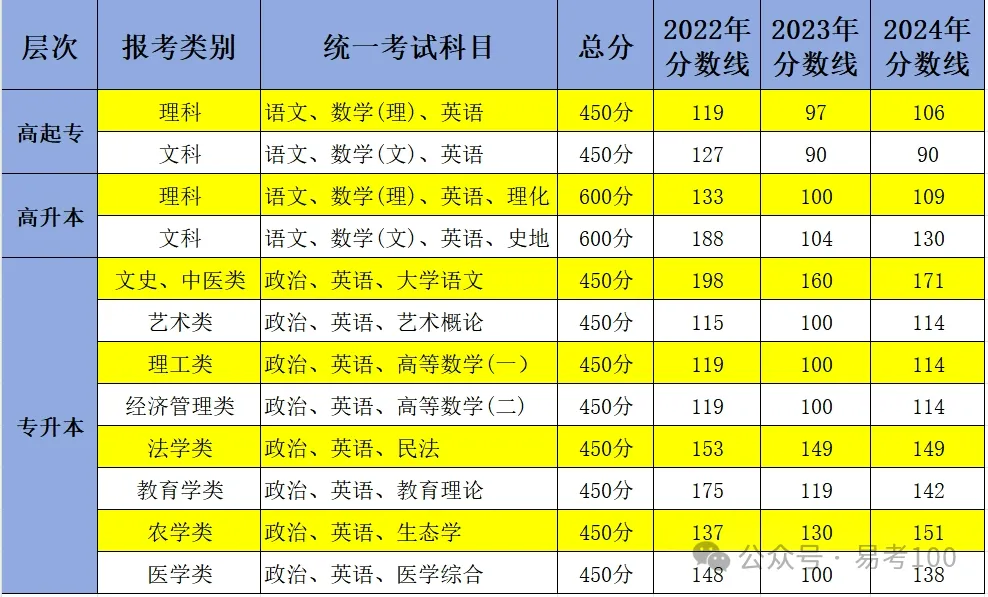 【备注】高起专、专升本考三科,150分/门,满分450分;高起本考四科,150分/门,满分600分。