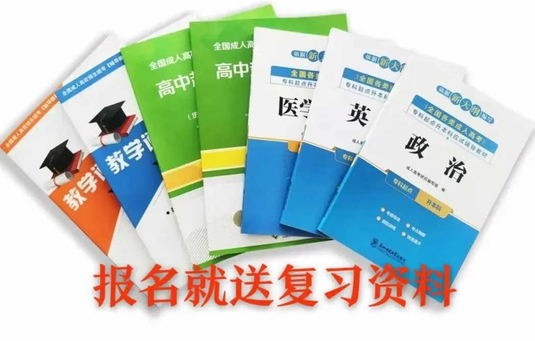 送成考材料(复习资料)+网络辅导课+成考报名服务(代报名,准考证下载,成绩、录取查询,报到注册,学籍注册。