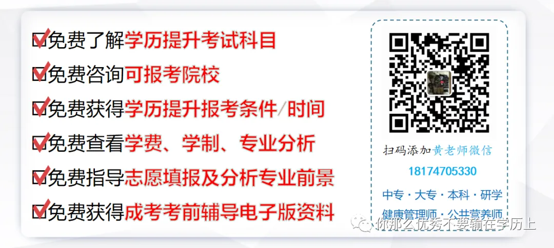 报名服务:(免费)成考材料(复习资料,通关秘籍,历年真题)+网络辅导课+成考报名服务(报名,准考证下载,成绩、录取查询,报到注册,学籍注册。)入学之后:建立班级群 ,专职班主任带班,全程通知服务,无需担心错过信息。第一步:点击下面公众号名片关注
