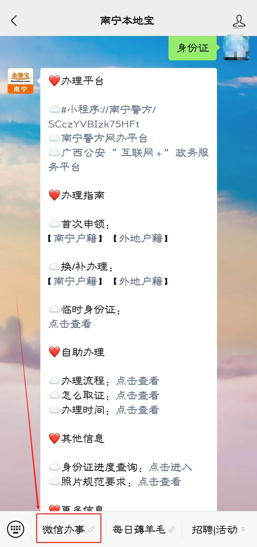 关注南宁本地宝微信公众号,在对话框回复【身份证】,可获南宁本地/外地成年人和未成年人首次身份证办理+换证详细办理指南、办理入口及进度查询入口、临时身份证办理指南。