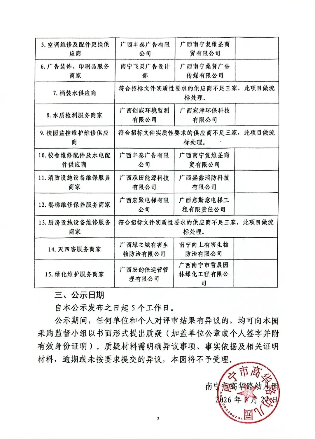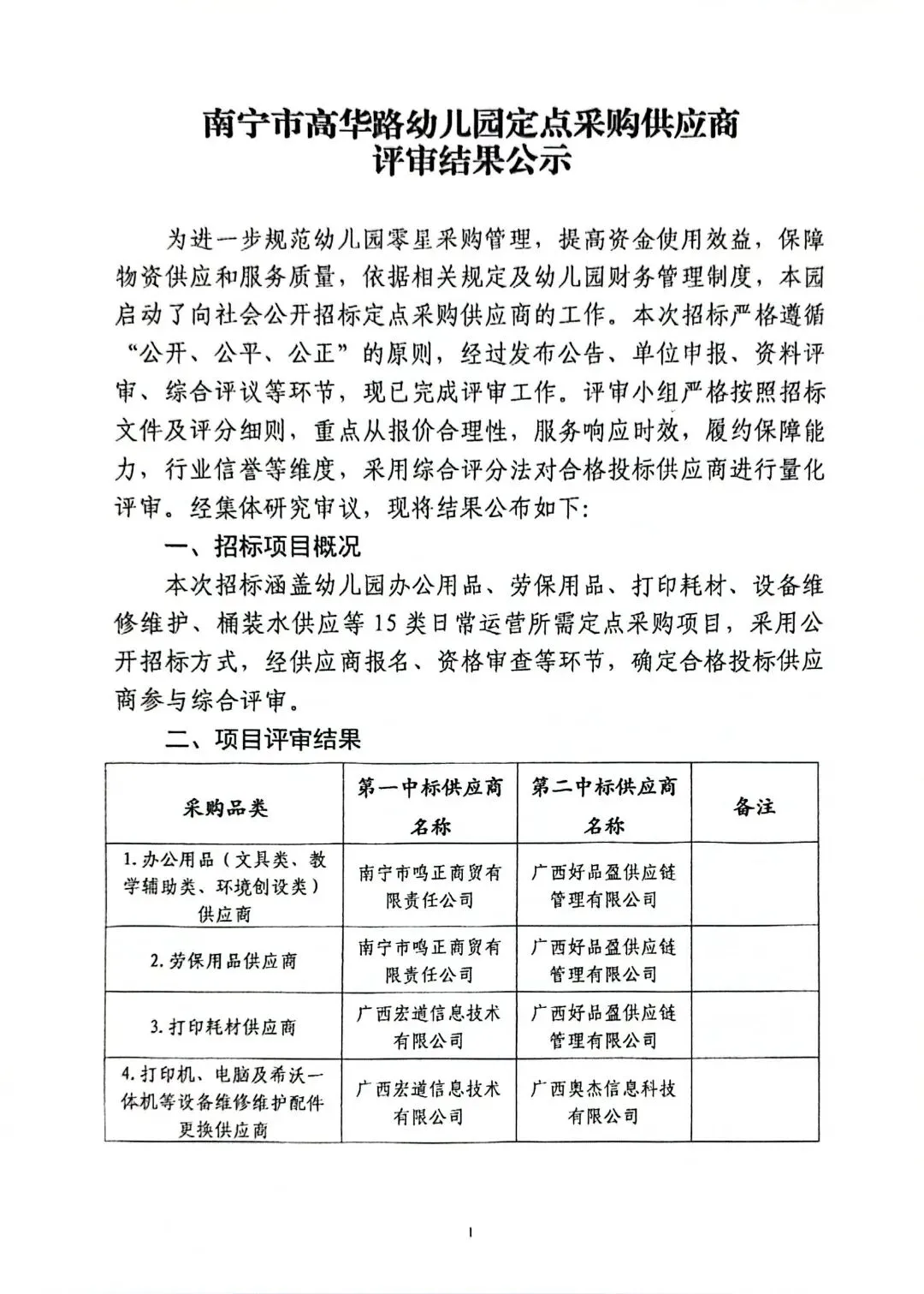 >南宁市高华路幼儿园定点采购供应商评审结果公示