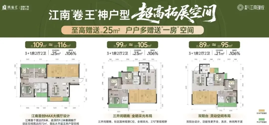 从产品来看,项目为 16-17 层小高层,容积率 2.5、绿化率 35%,居住舒适度优于高层。户型设计亮点突出:89㎡可拓展至 95㎡,6.3 米大横厅;99㎡拓展至 105㎡,7 米宽厅;109㎡为 8 米大横厅 + 南北双阳台,得房率高、空间利用率强。