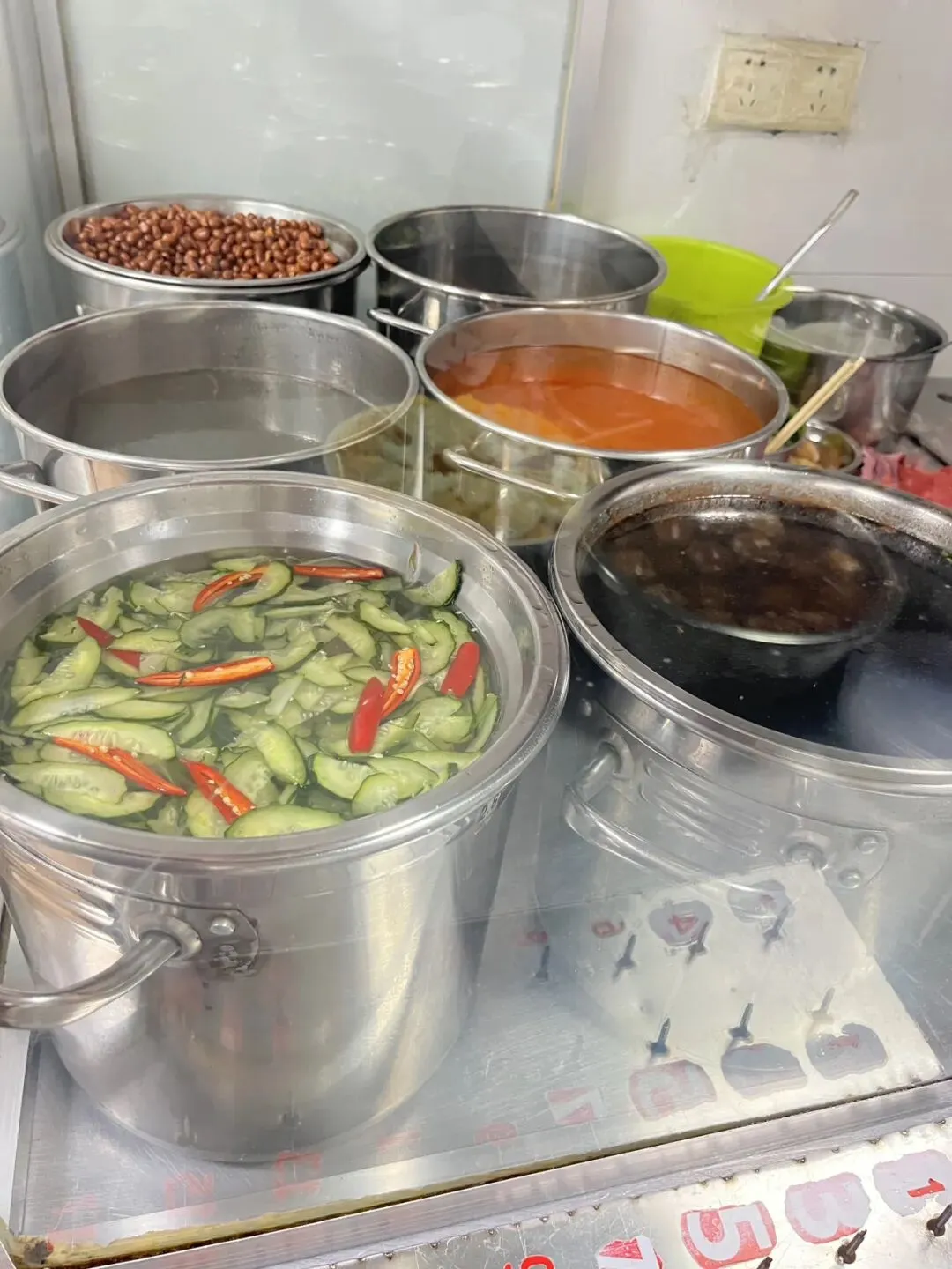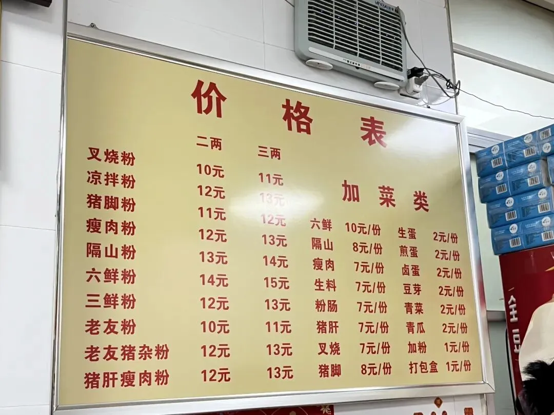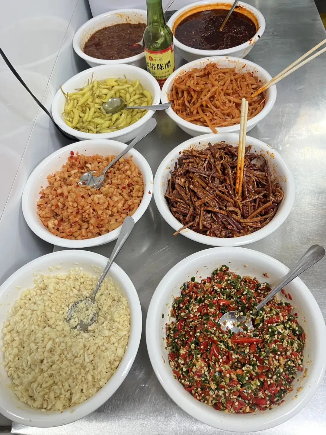 早上我和儿子在路边摊吃了肠粉,本着“来都来了”的心态,还是按计划去打卡了河池六圩老奶米粉。怕吃不完,我们只点了一碗。不知是肠粉太过鲜美,还是本身不太饿,这碗网红米粉并没有想象中那么惊艳,不过特色确实很足:三个木柄水瓢加水烧开,放入腌制好的肉哨、豆芽,再下入米粉,盛进大大的不锈钢碗里。桌子边上摆着两排小菜,最有特色的就是酸笋、酸笋丁和拌蕨菜;可以加的肉哨配料足足有二十多种,不得不说,南宁人是真的很会吃。