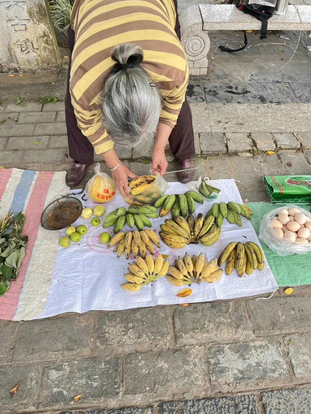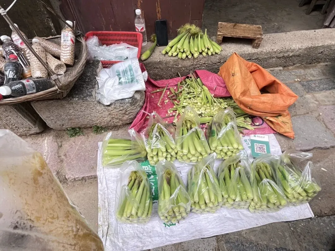 之前看视频说古镇没有过度开发,保留着原生态。走进古镇,确实就是一副农村乡镇的模样,只是种植的农作物不同,每隔一段就有老人摆的路边小摊,一块油布铺在地上,摆着自家做的萝卜干、梅干菜、芭蕉、木薯、辣椒、杨桃,生意做得很随性,价格也很便宜。芭蕉一元一斤,味道纯正,吃后嘴里不涩的那种;木薯蒸好的一元一个,糯叽叽的,这样的价格还真是淳朴。也有稍微正规一点的小店,卖着“扬美三宝”:豆豉、沙糕、梅干菜。沙糕8元一包,吃起来和恩施的桃片糕有点像,少了核桃仁,多了黑芝麻,口感更松软一些,我们不太合口味;豆豉和梅干菜离家太远不好携带,也就没有尝试。