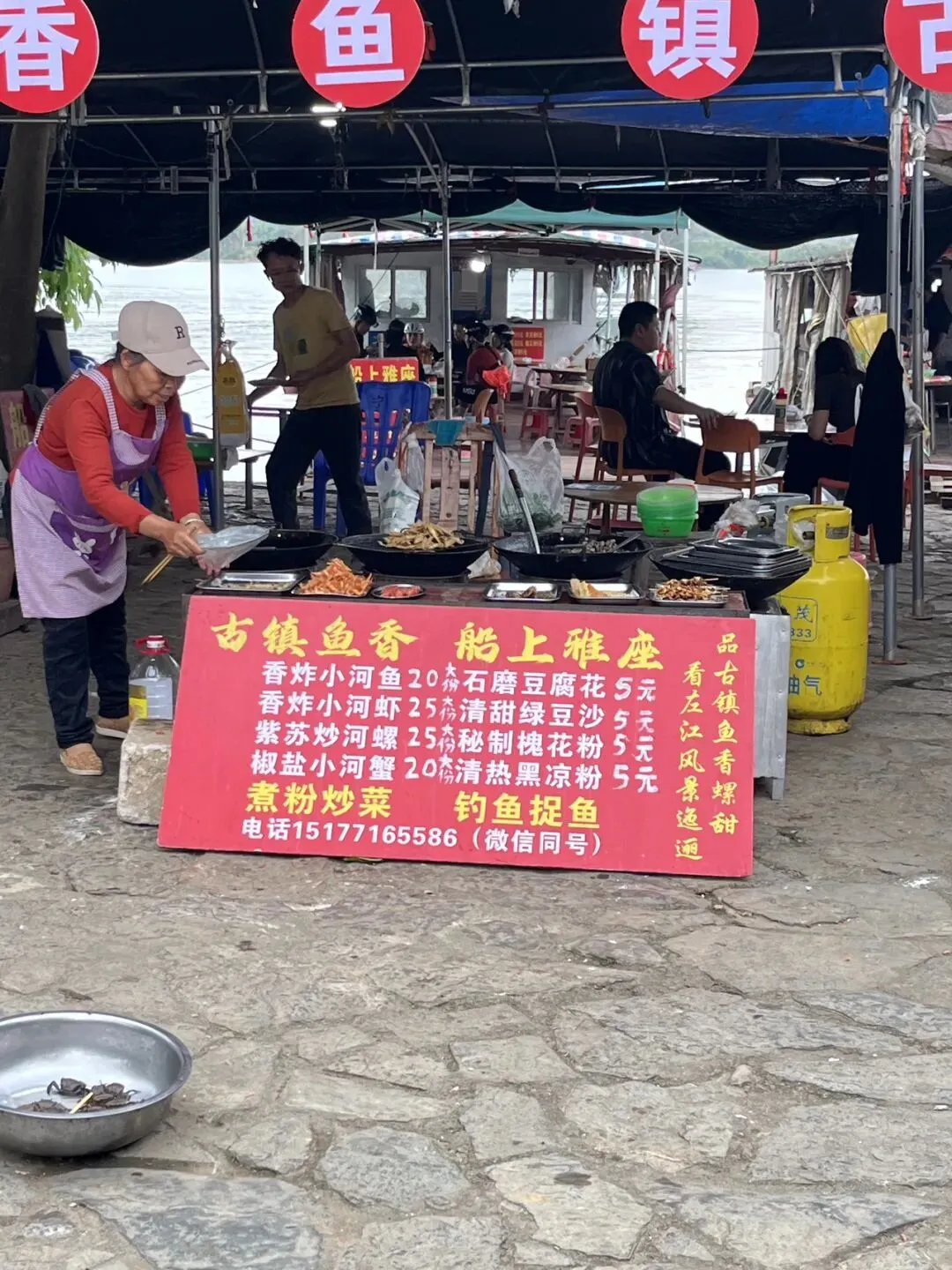 走到江边,江水还算清澈,岸边停着几条小船,一字排开都是卖小吃的村民,以老人居多——其实商业氛围,并没有说得那么淡。