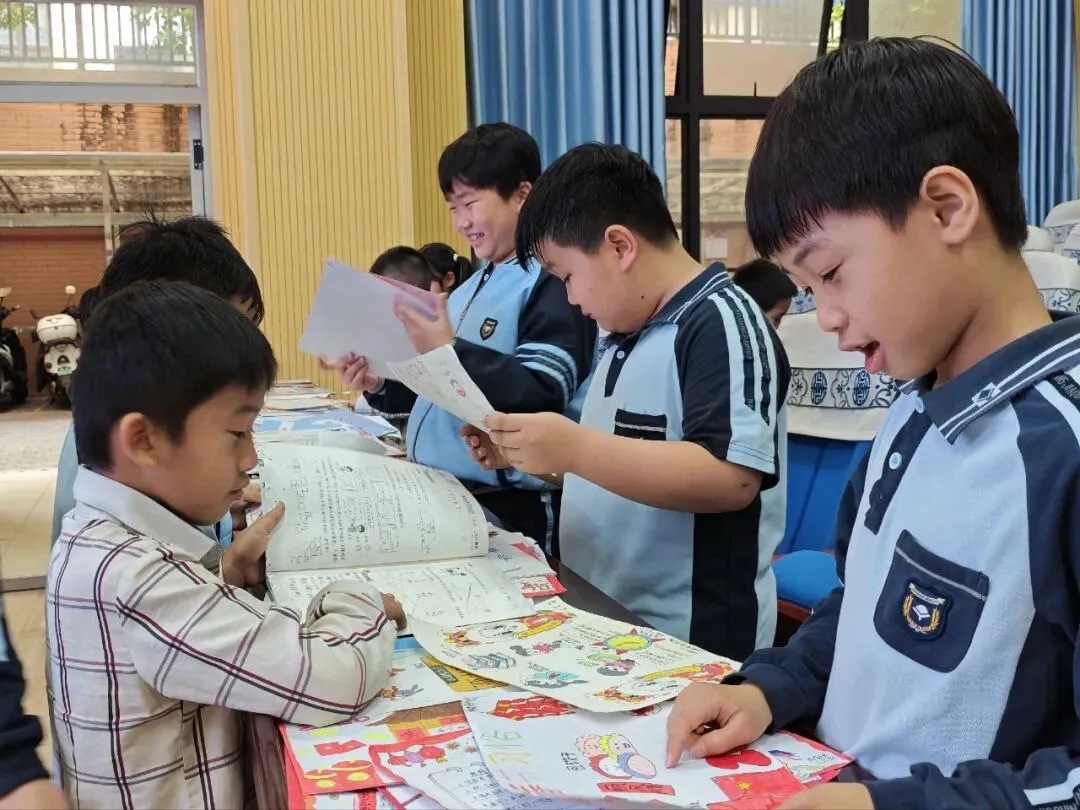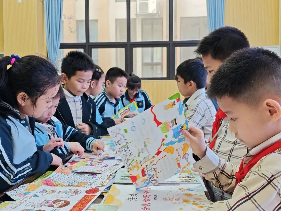 在作业展评的现场,同学们三五成群,围在一张张精心陈列的作品前细细品读。有的俯身凝视,指尖轻轻点在工整的字迹与斑斓的画纸上,目光里满是赞叹;有的驻足良久,在创意满满的实践作业前轻声交流,分享着发现的惊喜与灵感。