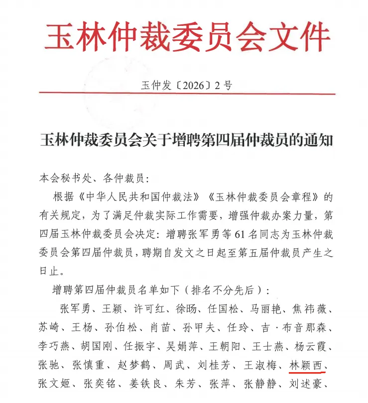 近日,玉林仲裁委员会发布《关于增聘第四届仲裁员的通知》,决定增聘61名同志为第四届仲裁员。其中,鸿州南宁分所林颖西律师凭借扎实的专业素养和丰富的实务经验成功入选,聘期五年。林颖西律师的入选,既是对其个人专业能力与职业操守的高度认可,更是鸿州南宁分所在争议解决领域深耕细作、服务法治建设综合实力的集中体现。