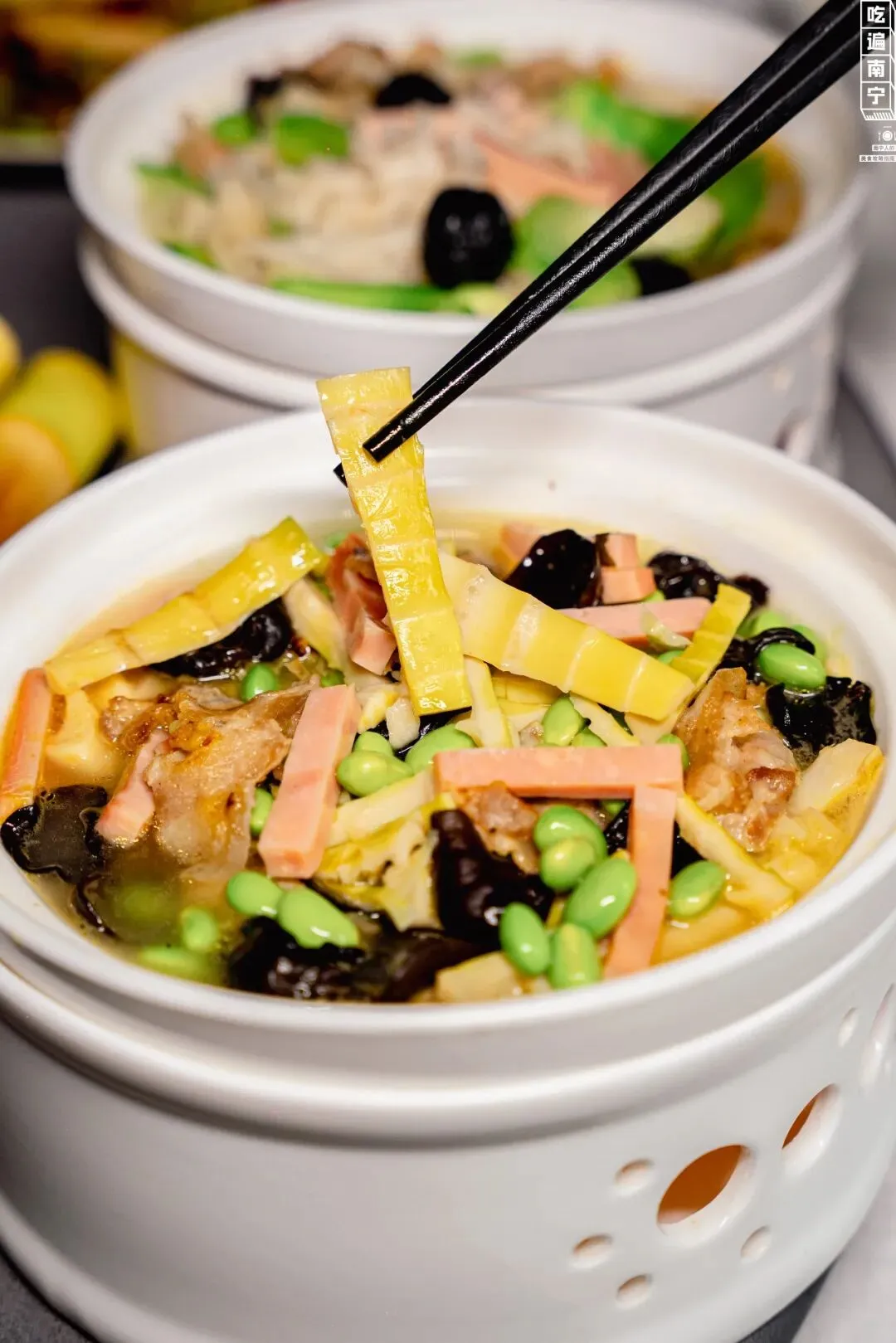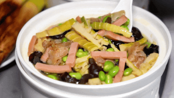 只取春日头拨嫩春笋,肉质脆嫩、清甜无涩,吸饱慢熬浓醇鸡汁,再搭配咸香醇厚的火腿提鲜。