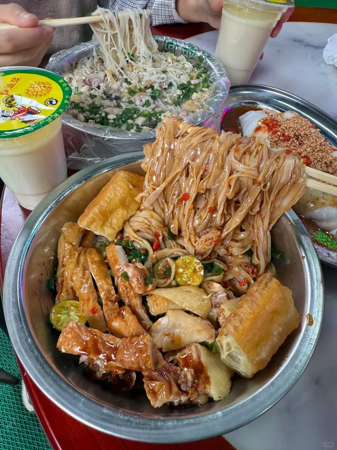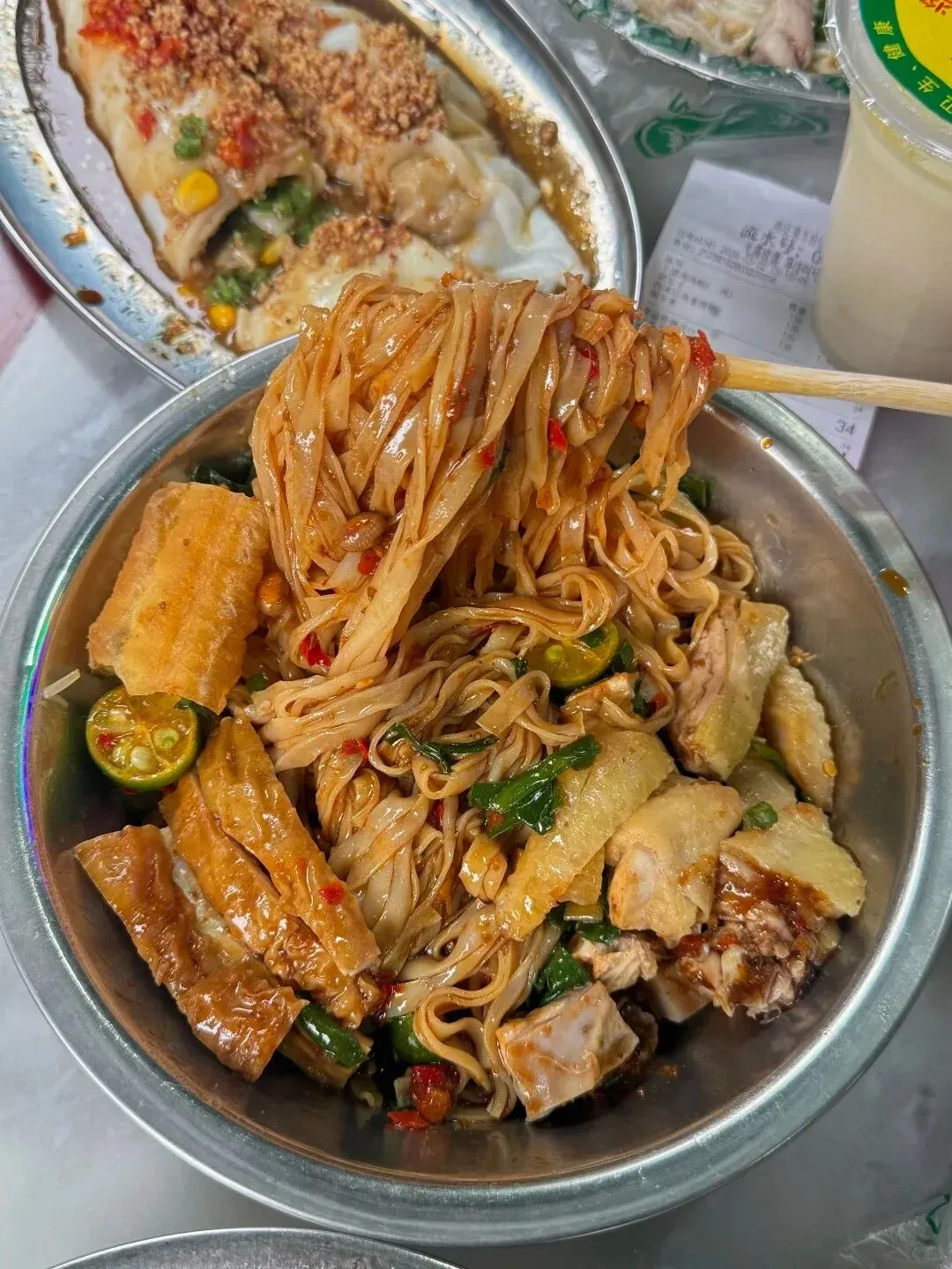 宽厚的粉条拌着大块的白切鸡肉,还有吸满汤汁的老油条,每一根粉都裹着浓郁的酱汁,色泽油亮特别诱人。