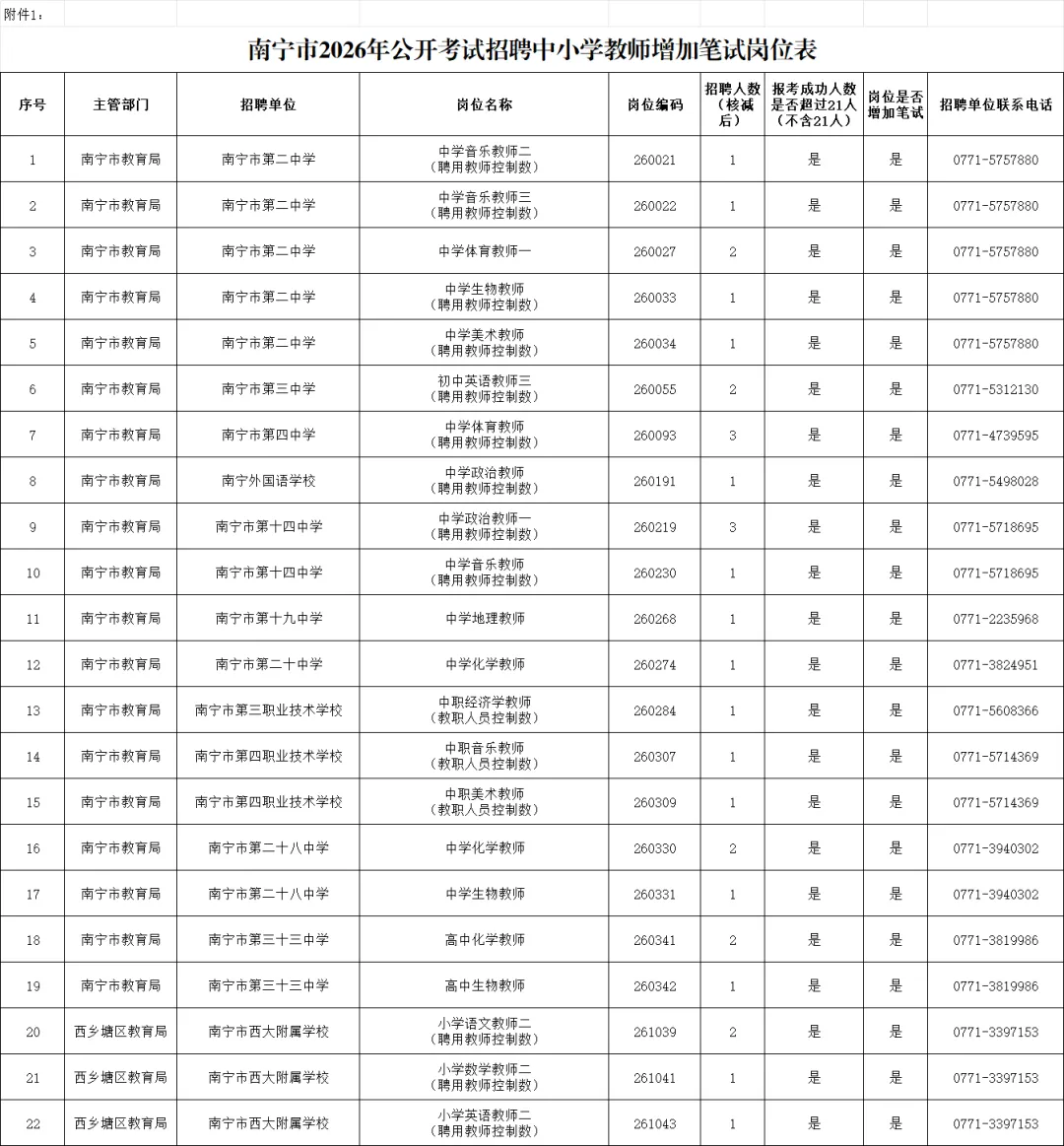 1.南宁市2026年公开考试招聘中小学教师增加笔试岗位表