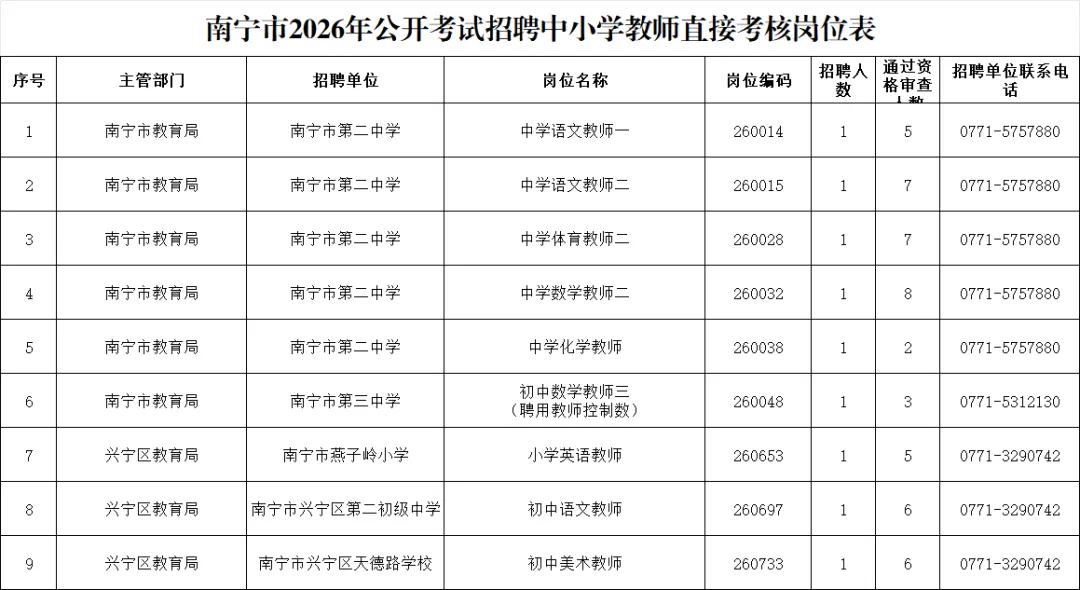 3.南宁市2026年公开考试招聘中小学教师直接考核岗位表