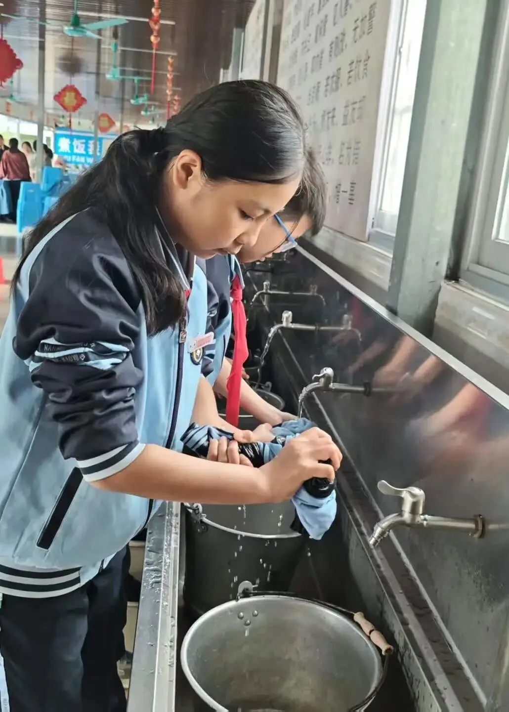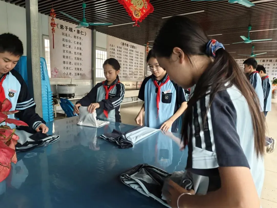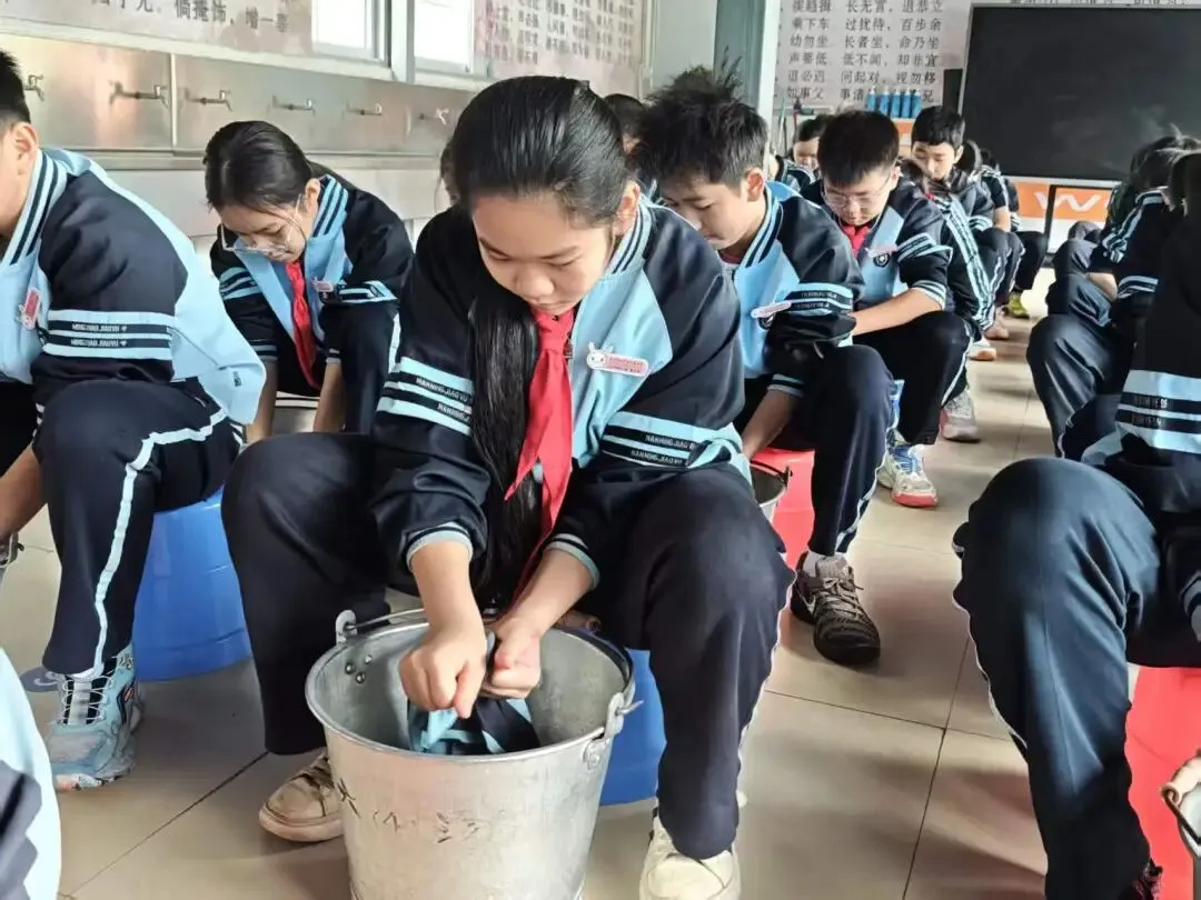 诵读结束后,实践活动正式拉开帷幕。同学们首先分组进行清洗衣物环节,大家挽起衣袖,认真揉搓衣物上的污渍。从打湿、涂抹清洁剂到反复揉搓、漂洗晾晒,每一个步骤都有条不紊。同学们的眼神里满是认真,在汗水与泡沫中体会到了家务劳动的繁琐与不易,也更能理解父母平日的辛劳。