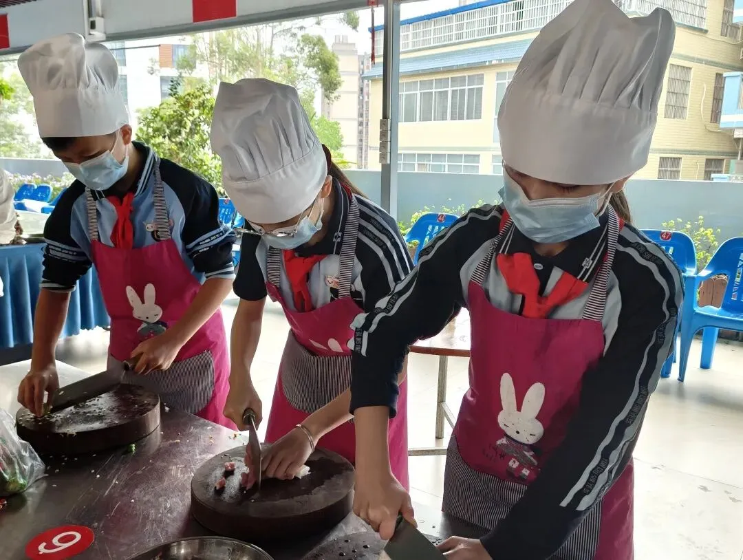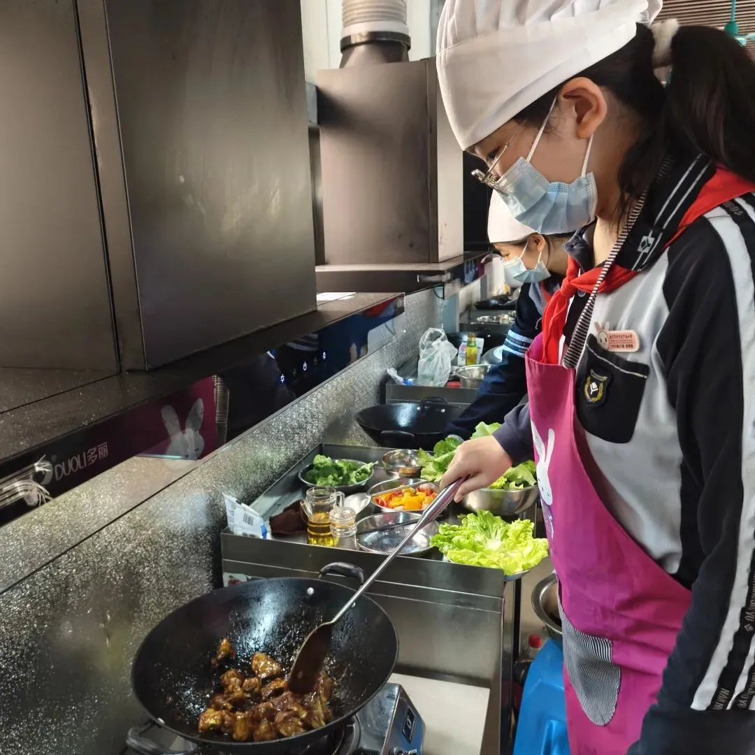 进入基地操作环节,同学们在老师和家长的指导下化身 “小厨师”,洗菜、切菜、翻炒、摆盘…… 厨房里一派热火朝天的景象。刀起刀落间,新鲜的食材变成了整齐的配菜;锅铲翻动中,香气四溢的菜肴逐渐成型。大家互相帮助、分工协作,在实践中掌握了基本的烹饪技能,也体会到了 “自己动手,丰衣足食” 的快乐。