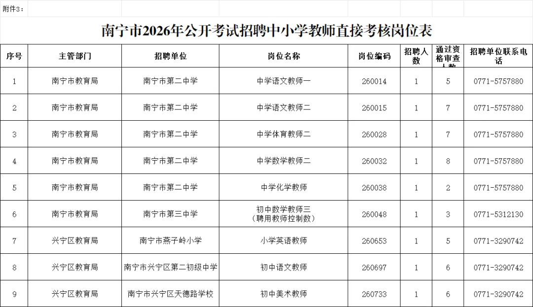 3.南宁市2026年公开考试招聘中小学教师直接考核岗位表