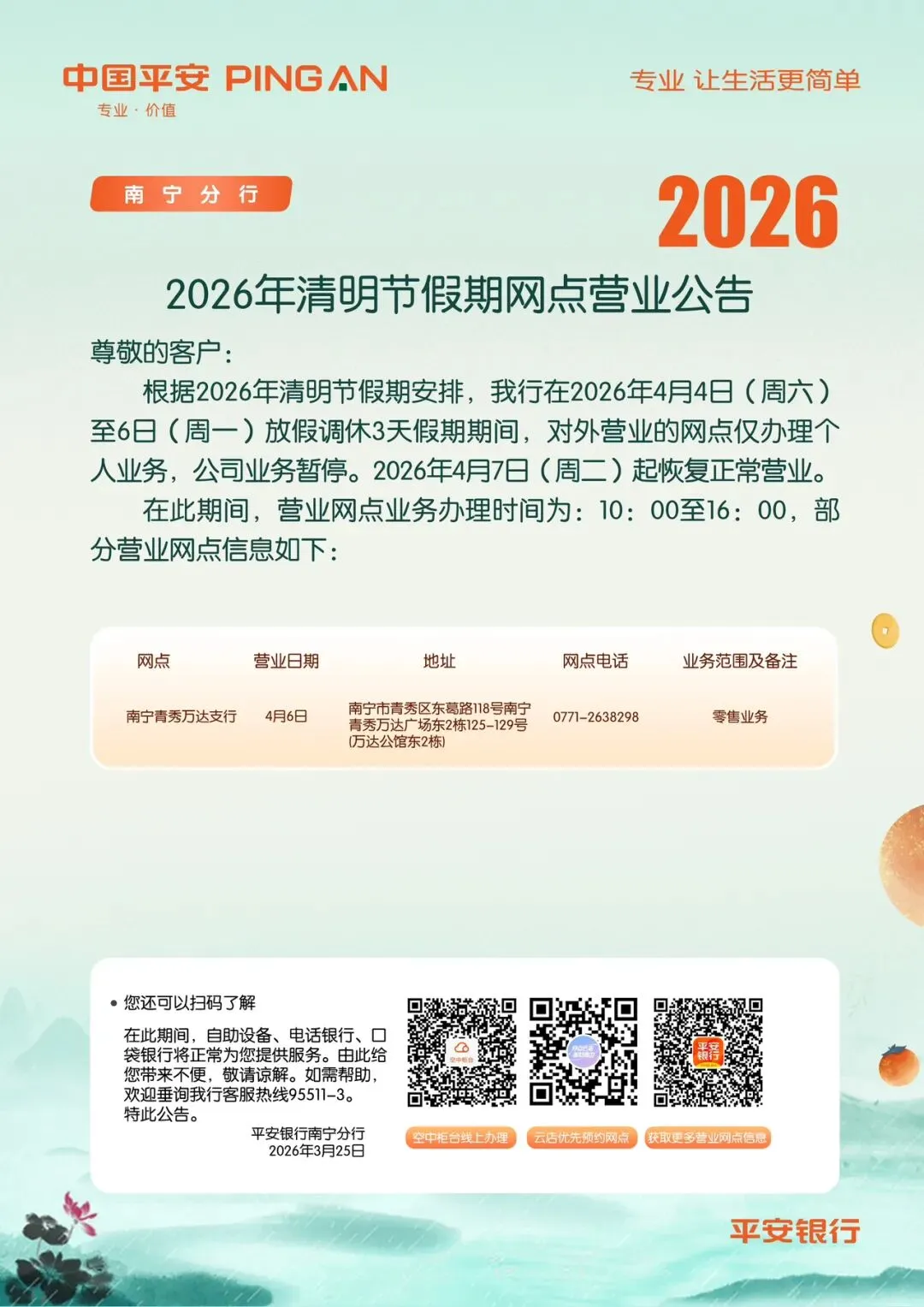 平安银行南宁分行2026年清明节假期网点营业公告