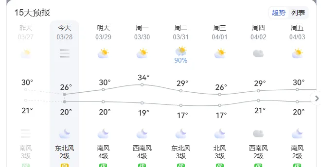 南宁市未来一周(3月28日至4月3日)降雨量偏少,平均气温偏高。周内无明显降温和降雨天气过程,除3月31日局部有阵雨并伴有雷暴大风等强对流天气外,其余时段以多云到阴为主。
