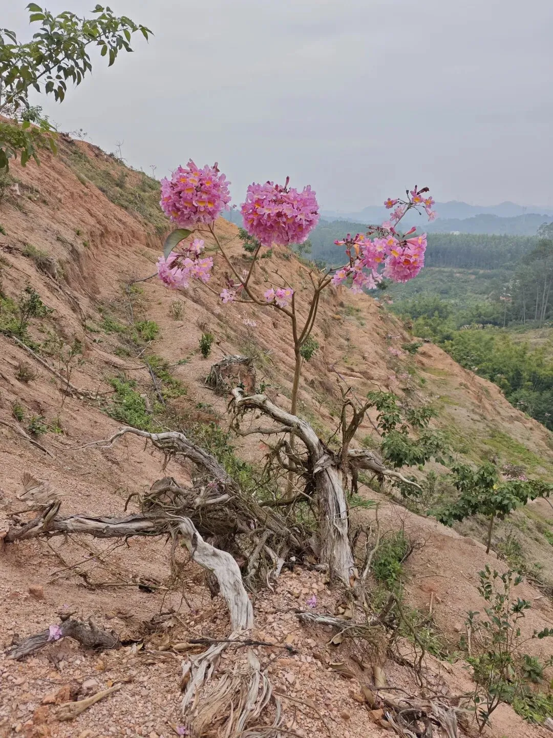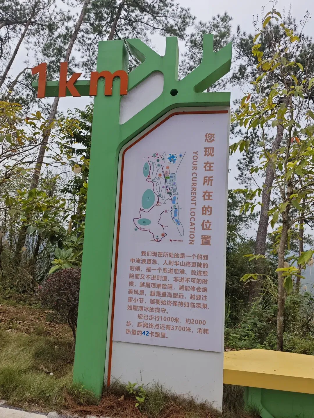 走到半山腰一草亭,右边光秃秃的山头,几株紫红色风铃木迎风摇曳,似乎在向我们招手。顺着山头望过去,一目千里,连绵不断的山脉,层峦叠嶂,心情顿时格外愉悦,连日来的疲惫也随风消散,终于懂了人们为何总爱结伴去爬山——这山巅的辽阔,本就是治愈人心的良药。 爬到第一个坡顶,出现这种路程指示牌。整个景区有5块指示牌,沿景区一周,全程4.7公里。因为几座山体相连,山高坡陡,我们选择开电车上山,沿路开开停停,遇见花草便俯身细赏,瞧见古朴的凉亭就歇脚休息。 玉兰花乘着清风,扑鼻而来。我们忍不住停车,拾起了零落在地的花瓣,花味淡雅而清香。