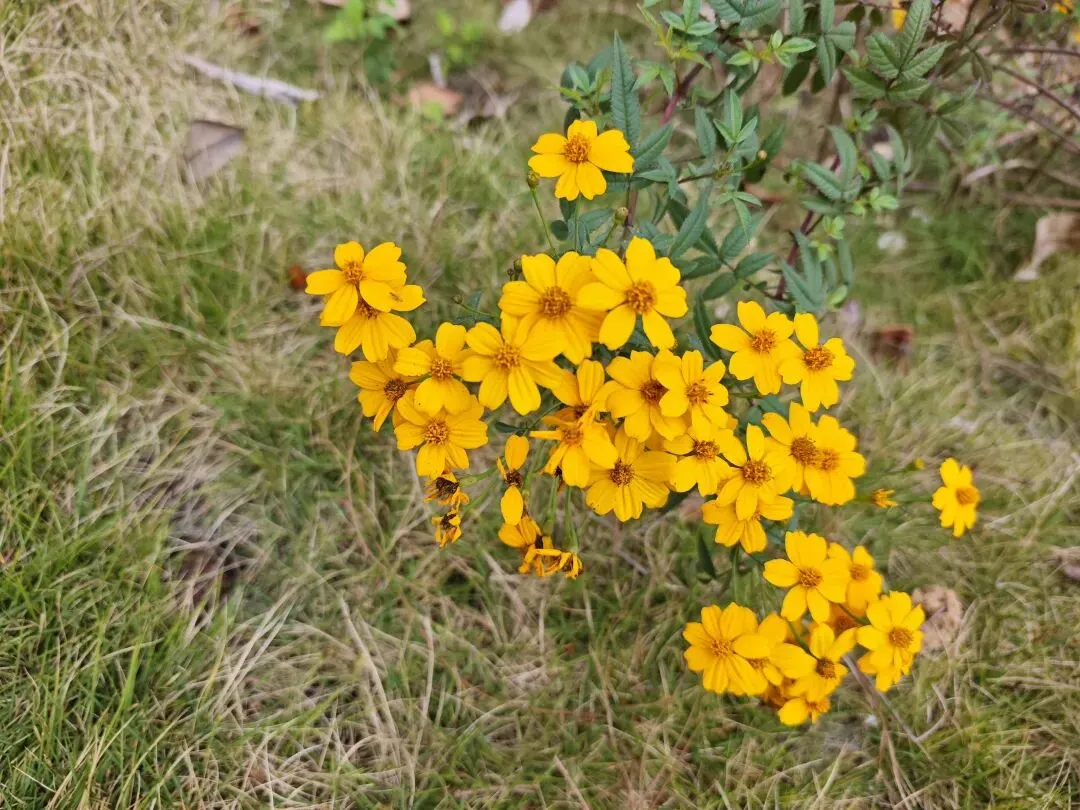 旁边小朵小朵的桔黄色菊花随风轻摇,我原以为是野菊花,顺势俯身闻闻,一股甜甜的香味,极像百香果的香味。