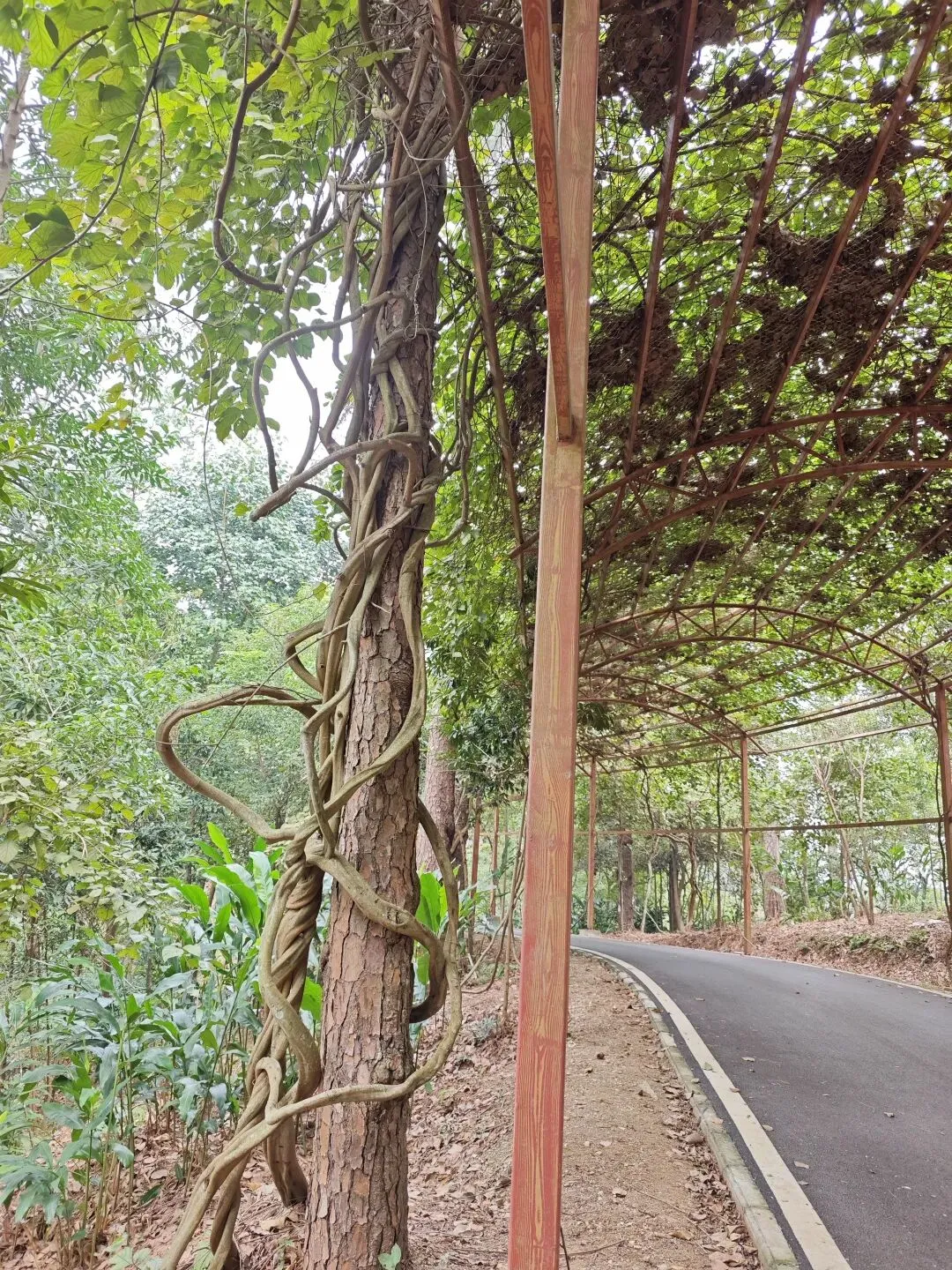 走到3公里处,进入了鸡血藤长廊。藤蔓如游龙般的鸡血藤,依附着附近的树枝干,蜿蜒穿梭,层层攀附而上,将绿意从地面一直铺展到树冠,织成藤状绿荫。藤蔓盘曲交错,宛若脉络,向上输送生机。