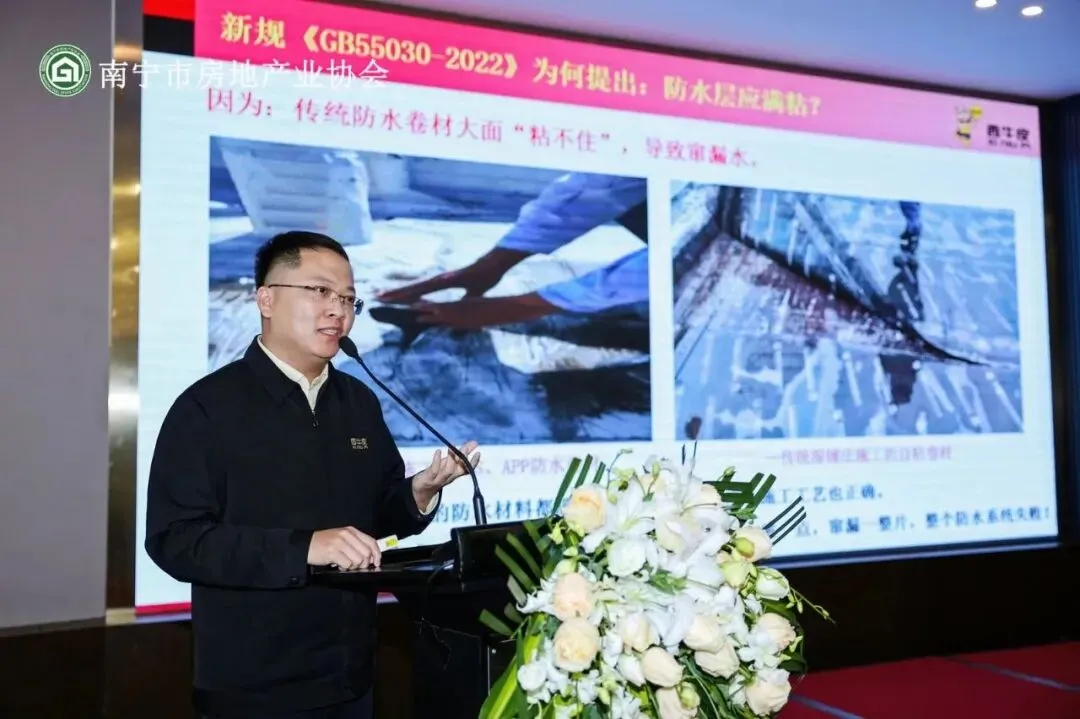 作为本届会员大会的承办单位,西牛皮防水科技有限公司副总经理蓝宏锋在大会发表讲话,并通过视频演播讲解和现场展示的方式进一步展示西牛皮防水科技产品对品质把控的责任心,也希望与各房地产开发企业建立交流合作。同时祝愿房地产行业在新的一年蒸蒸日上。