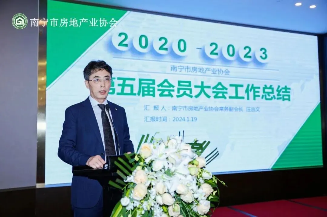 大会第八项议程由市房协副秘书长林洁主持,依法选举产生第六届领导班子。经大会全体会员单位表决,汪忠文同志当选为会长;徐德海同志当选为监事长;黄世光、李雪峰同志当选为常务副会长;47家会员单位成为理事会成员;林洁同志当选为秘书长。由南宁市住房和城乡建设局房地产市场监管科科长佘振平为市房协第六届领导班子颁发职务牌匾。新任会长汪忠文表示,第六届领导班子将以坚持稳中求进的态度努力做好工作,持续发挥桥梁纽带作用,坚持服务为本、发展为要,做好行业政策研究分析,为政府提供决策参考,与会员一道携手同心,筑牢初心使命,增强行业自律和信用建设,聚合行业智囊,共同探索行业发展新模式,营造良好的市场环境。 大会第九项议程,由市房协第六届常务副会长黄世光做2024年工作计划,市房协将继续以服务会员为宗旨,坚持“房住不炒”的定位,务实工作作风,开展政企交流、提出可行性建议、组织企业赴省外交流学习、举办营销活动等一系列工作。
