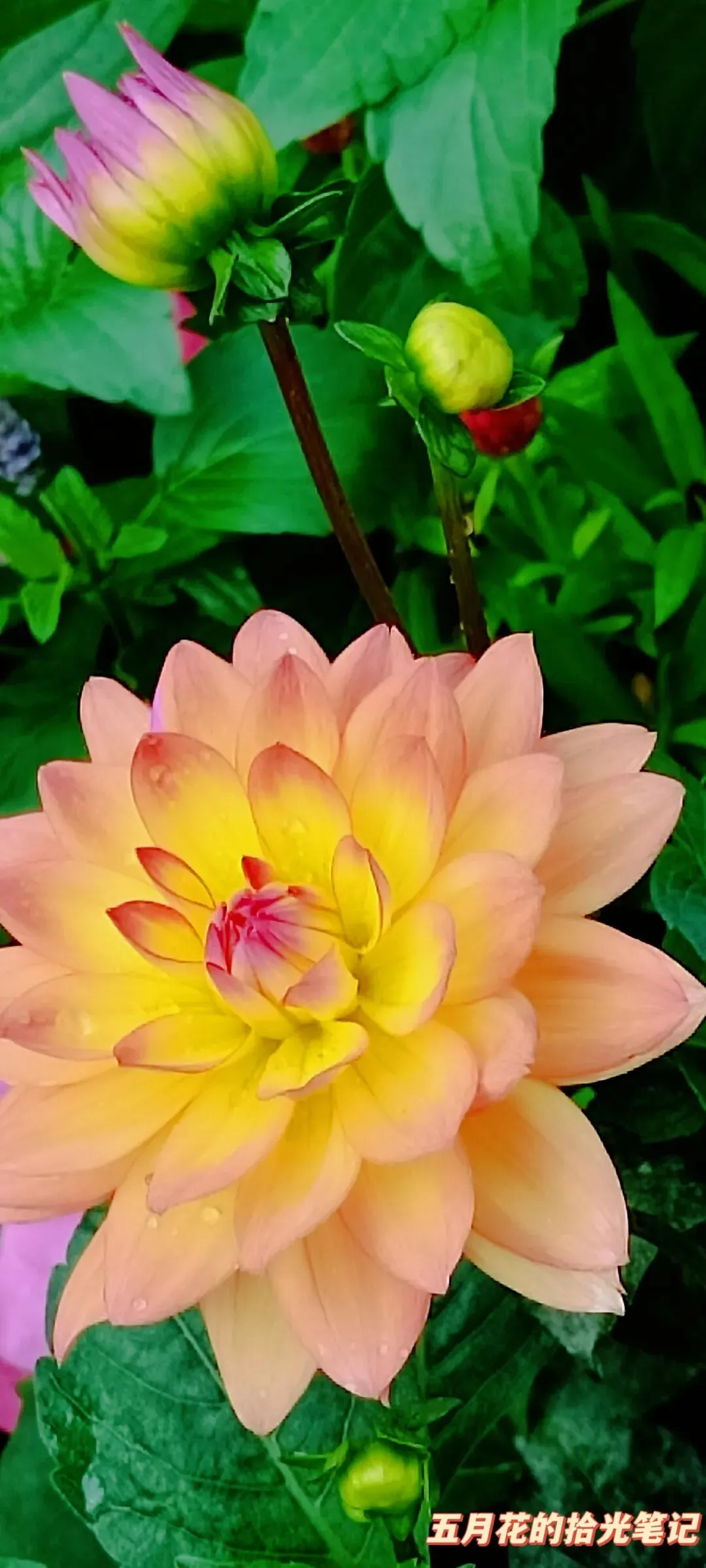 我以前也养过大丽花,红的、白的、粉的都见过,可这朵还是让我眼前一亮。暖黄的花心,慢慢晕成粉橙的花瓣,层层叠叠裹在一起,雨后挂着水珠,远远看去就像自带一层柔光,说它“自带佛光”真的一点不夸张,神秘又温柔,完全是大丽花里的“颜值天花板”。