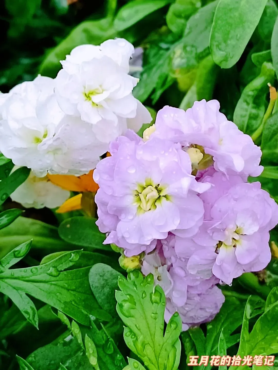 春雨过后,最水灵的就是这丛重瓣紫罗兰了。我拍到的是淡紫和奶白两个经典花色,花瓣层层叠叠,摸起来软软的,花瓣中心带着淡淡的黄绿色花眼,叶片肥厚还带着一层小绒毛,挂着水珠的样子,就像刚洗过脸一样,嫩得能掐出水来。