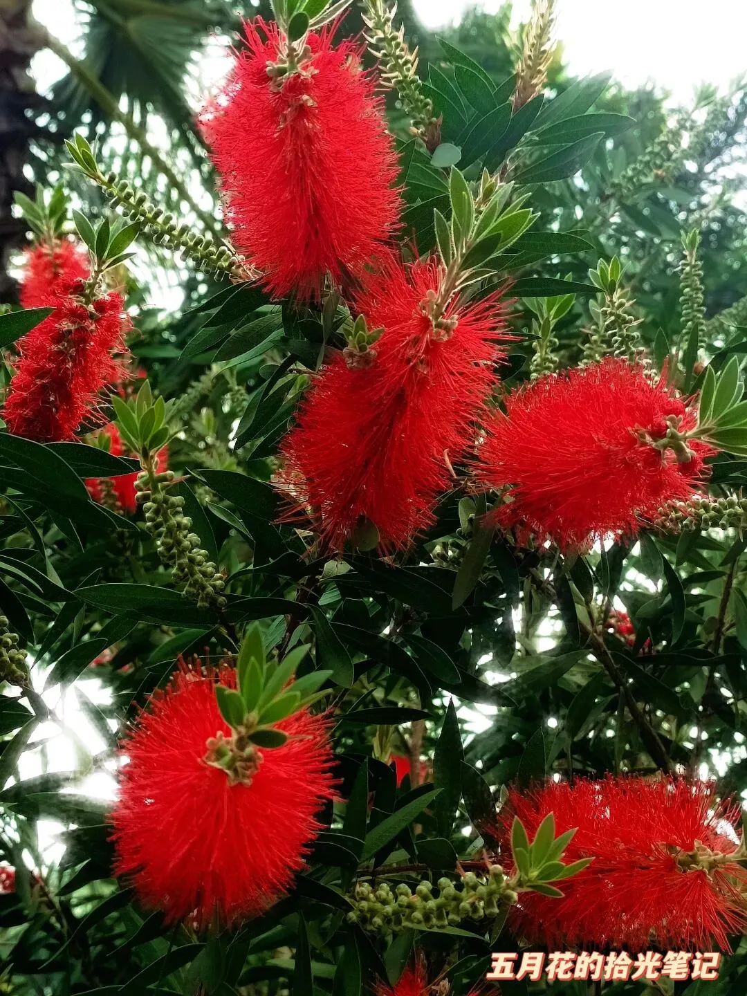 最后要聊的,是南宁街头、公园最常见的红千层,也叫瓶刷子花、金宝树。它的穗状花序太有特点了,无数鲜红色的雄蕊密密麻麻排在花轴上,就像一把把红色的瓶刷,风一吹轻轻晃动,特别有活力。