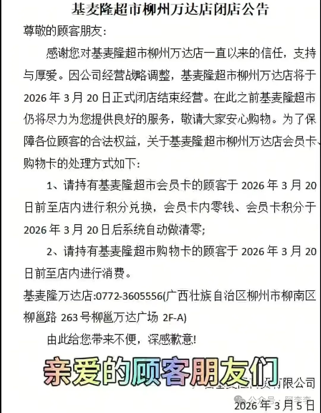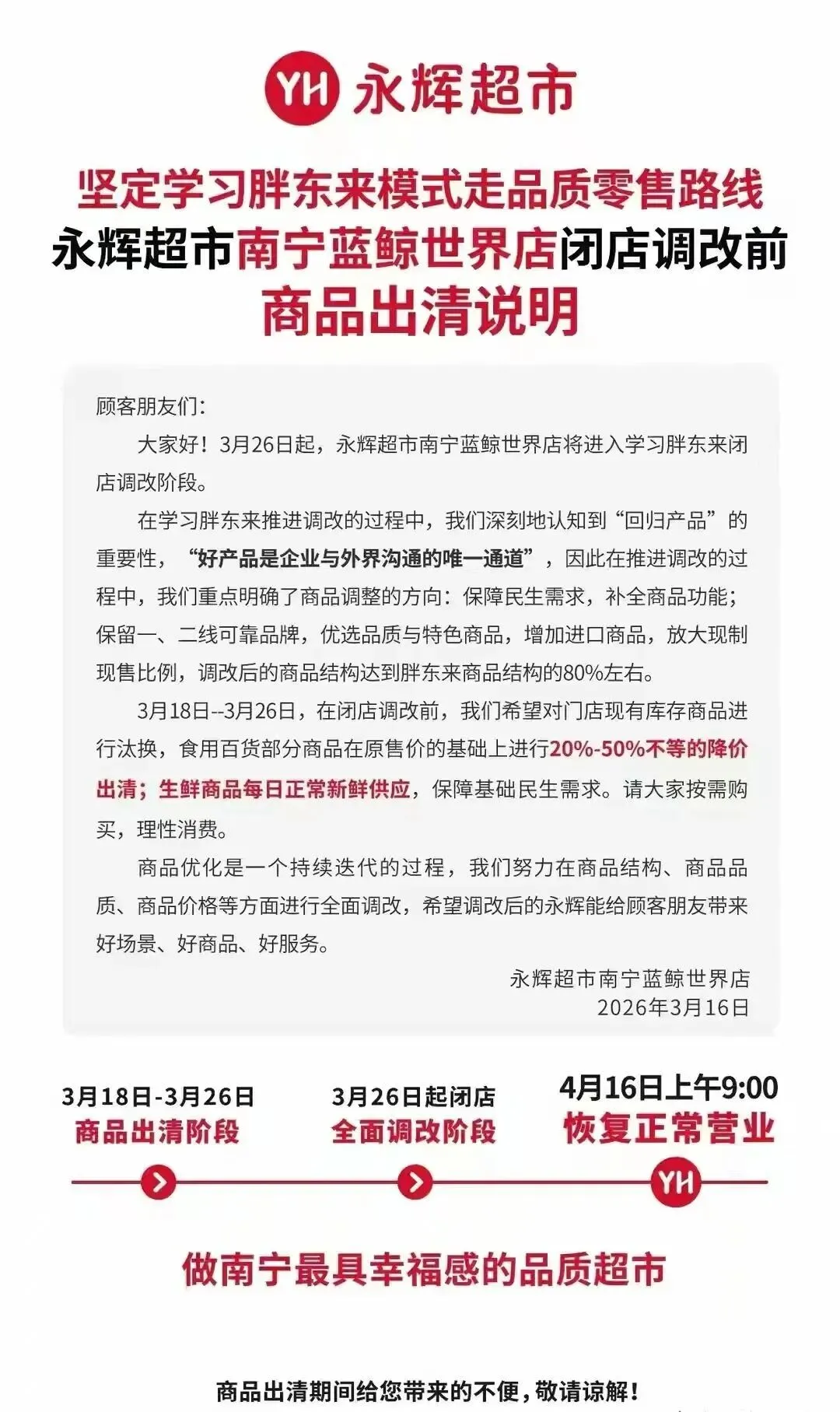 现在超市难做是不争的事实,大家都看在眼里,就在这两个月里,柳州人亲眼见证了城中万达的冠超市于2月19日倒闭,柳南万达的基麦隆超市于3月20日闭店。想想看,在万达里人流量如此之大的地方,这些品牌连锁超市都开不下去了,其他超市的境况可想而知。但也不是所有的超市都难,像胖东来,大家伙儿去那里购物就跟进货似的,甚至胖东来超市已经成了一个旅游打卡点,里面的东西并不便宜,但大家还是愿意去并且愿意专程大老远的去那里购物。为啥?就俩字“硬核”,商品的品质硬核,都是经过严选的,安全放心。服务硬核,无理由退还且定价透明,细节服务更是拉满,给人的体验非常好,此外其他方面也硬核,懂的都懂。现如今南宁一家永辉超市蓝鲸世界店也准备学学胖东来了,这家店早在十天前就发了公告,表示在3月26日这天正式进入学习胖东来全面调改,他们认为“好产品是企业与外界沟通的唯一通道”。在店门口也挂出了整改横幅,上面写着:永辉超市从心出发,坚定学习胖东来模式走品质零售路线。看得出来该店的整改决心很大,在整改之前已经将店内的商品进行打折促销,有些甚至打对折。26号之后正式闭店进入全面整改阶段,预计到4月16日恢复正常营业,到时候将以焕然一新的面貌呈现出来。“人家胖子愿意把大部分利益分给员o不愿意把利益放给员工的,学有啥用?”“采购源头必须经常突击检查,拒绝那种用“0”做商标之类的商品。”“越改越难,把畅销品都给干掉了。”