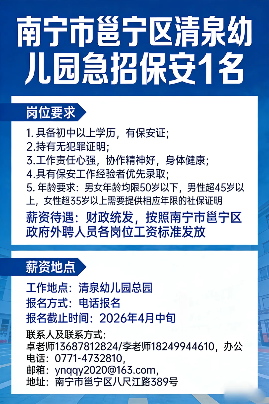>南宁市邕宁区清泉幼儿园急招保安1名