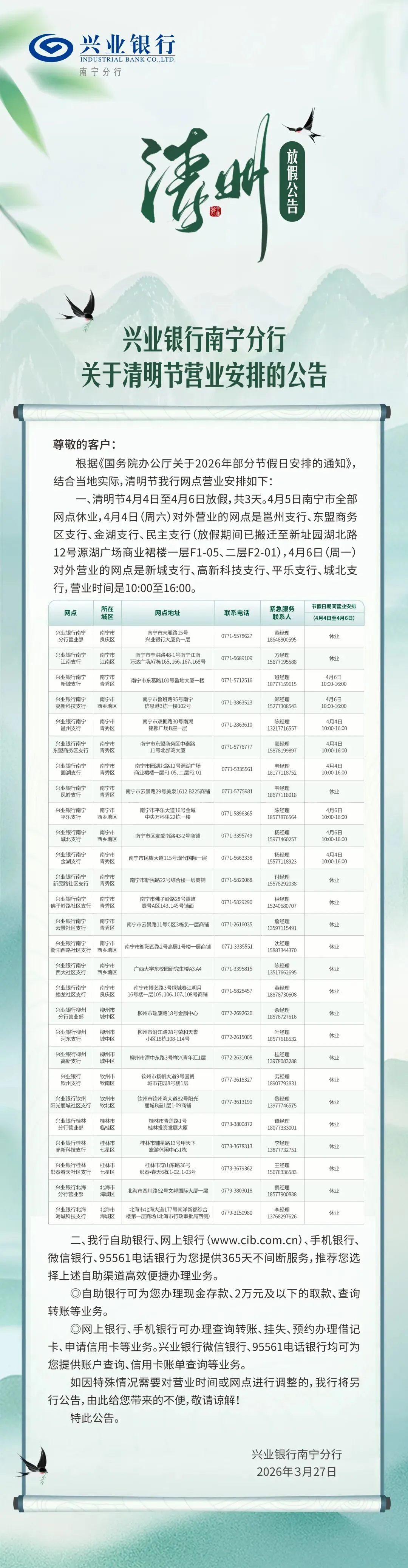 兴业银行南宁分行关于清明节营业安排的公告