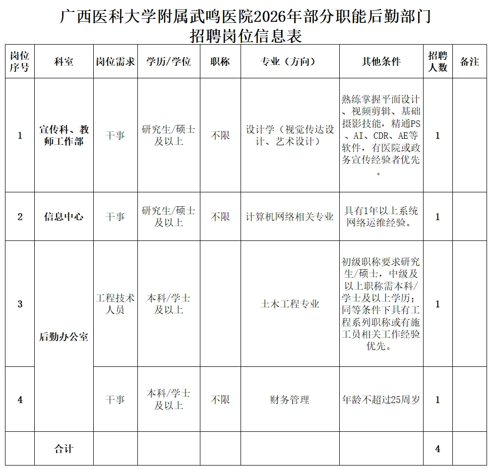 广西医科大学附属武鸣医院(广西医科大学武鸣临床医学院)是广西医科大学直属附属医院,是一所集医疗、教学、科研、预防、保健、康复等功能于一体的国家三级甲等综合医院。根据医院工作需要,现面向社会开展2026年部分职能后勤部门招聘工作,拟招聘工作人员4名。现将有关事项公告如下: