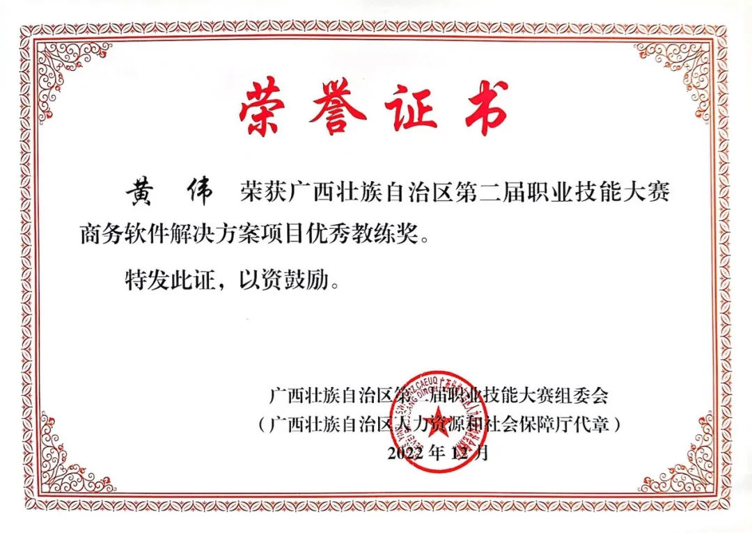 黄伟老师荣获广西第二届职业技能大赛优秀教练奖