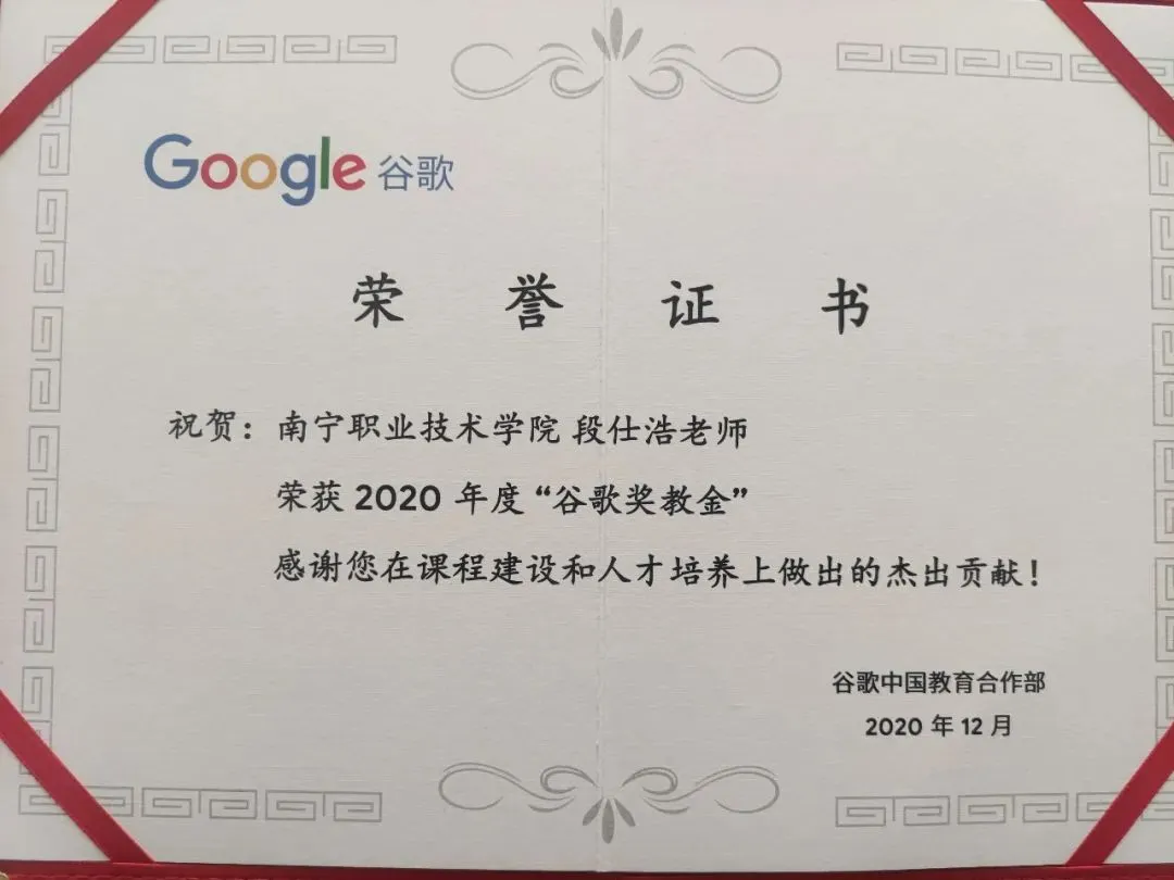段仕浩老师荣获“谷歌中国教育合作奖教金”表彰