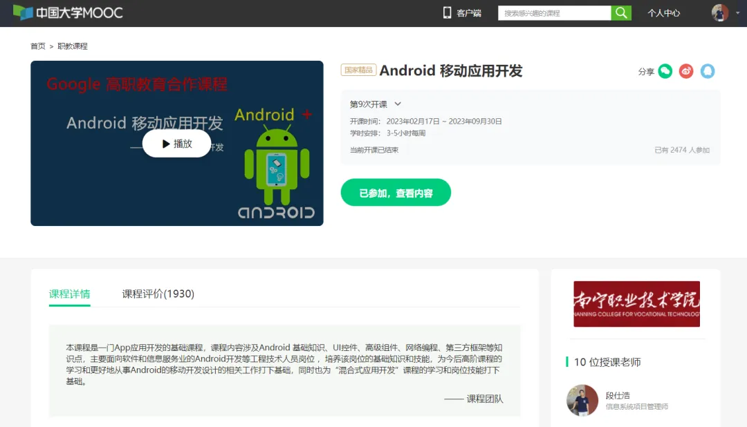 国家级精品在线开放课程、广西课程思政示范课程“Android移动应用开发”