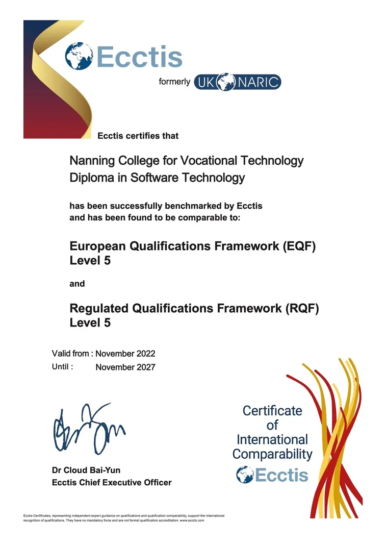 软件技术专业取得UK NARIC国际专业标准评估认证(EQF 5级,RQF 5级)