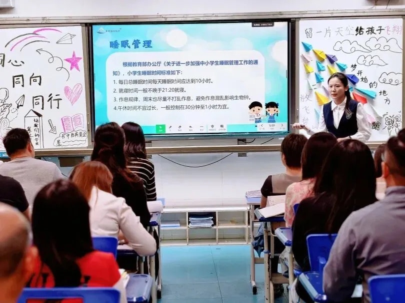 家长会以班主任深情诵读“梦源心语”温情启幕,传递学校“全面发展、健康第一”育人观,介绍学校在体育、心育的扎实实践,倡议落实“睡眠约定”,并呼吁家长当好孩子运动的“陪练员”、情绪的“收纳箱”、习惯的“守护者”与学校教育的“合伙人”,让“健康第一”的共育理念浸润人心、凝聚家校共识。