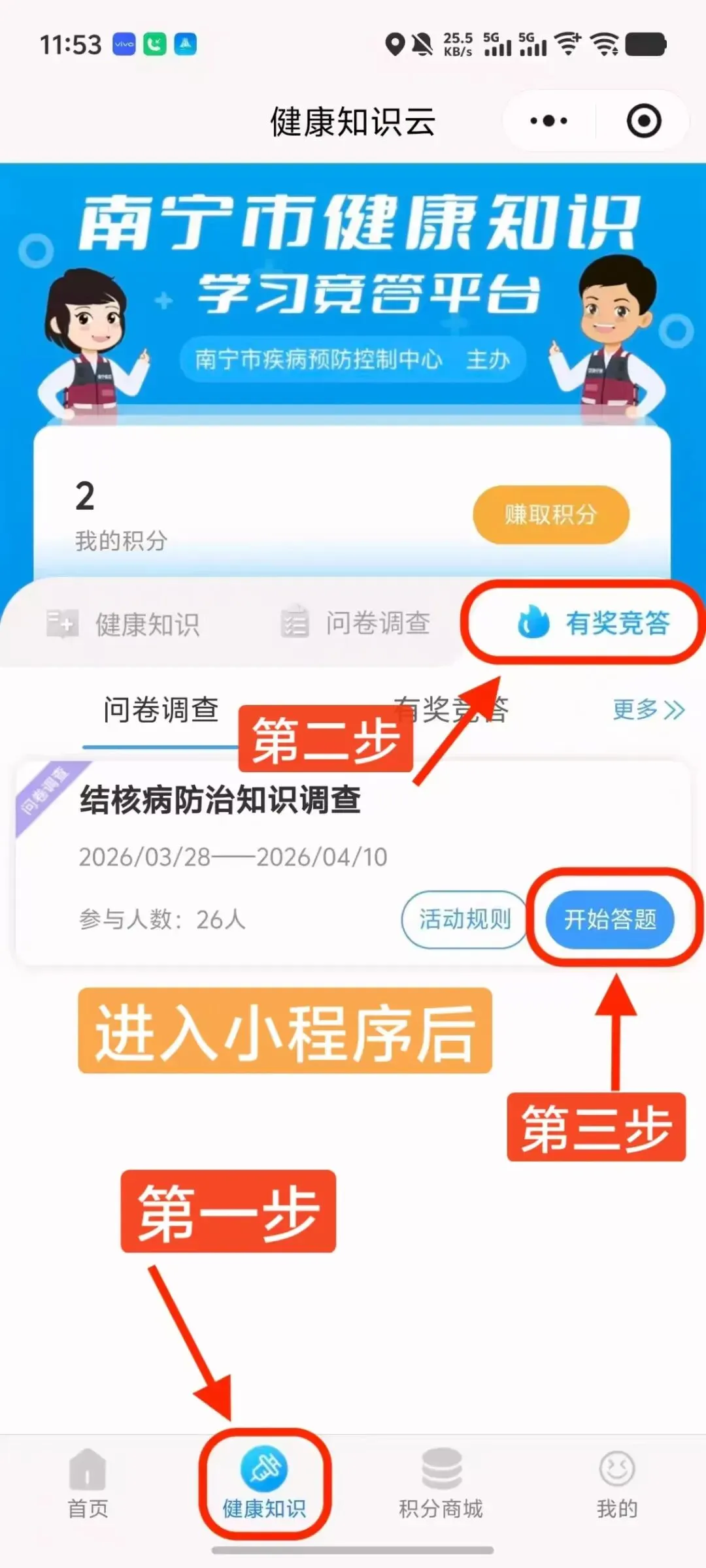 方式一:南宁疾控小程序→健康知识→有奖竞答