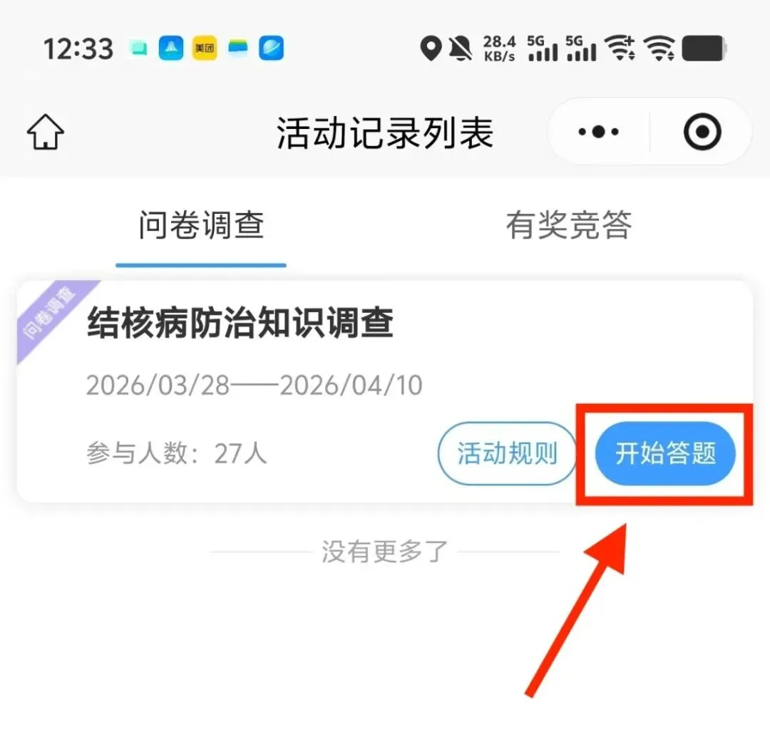 1、用户进入活动页面后,点击“开始答题”,系统将生成20道结核病相关知识题目;