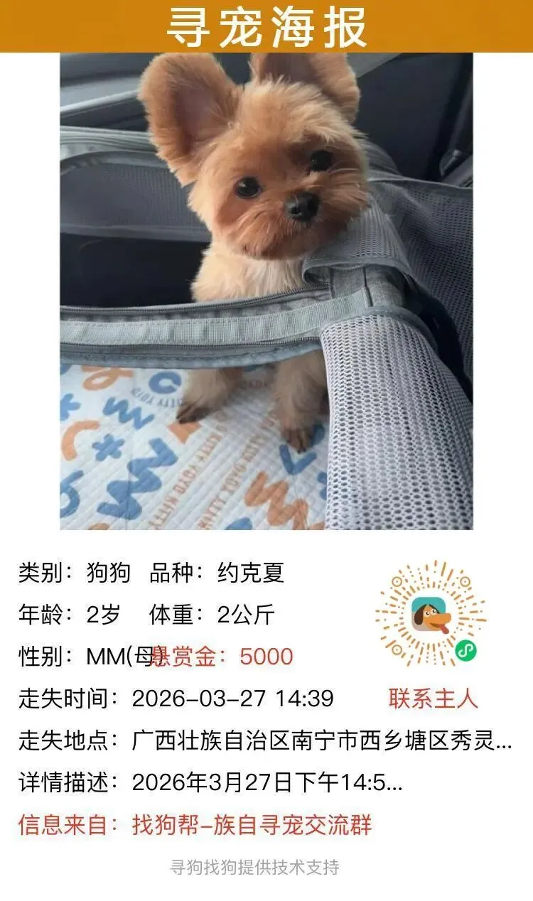 #南宁寻狗# 西乡塘区秀灵路14号附近走失一只约克夏,如有好心人看到或者收留请联系主人或本平台