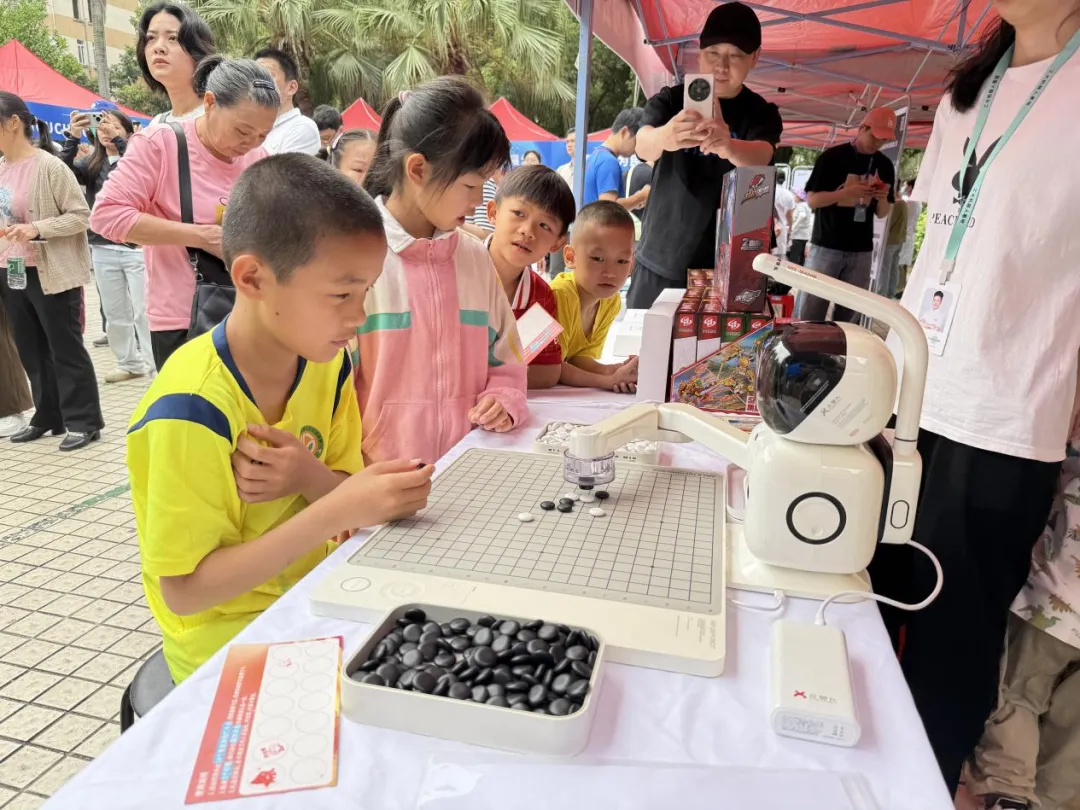 智慧教育展区则成为孩子们的“科技乐园”。工大机器人基地项目带来了机器狗、跳舞机器人、下棋机器人、大疆战车、机甲等智能设备,广西智都科技有限公司展示了机器狗、智能眼镜和足球无人机,中广数字科技(广西)有限公司带来了AI鼠标、AI学习平板、AI翻译器等产品,南宁山姆超市有限公司的北斗AI智能点读地球仪和元萝卜下棋机器人也吸引众多孩子驻足体验。
