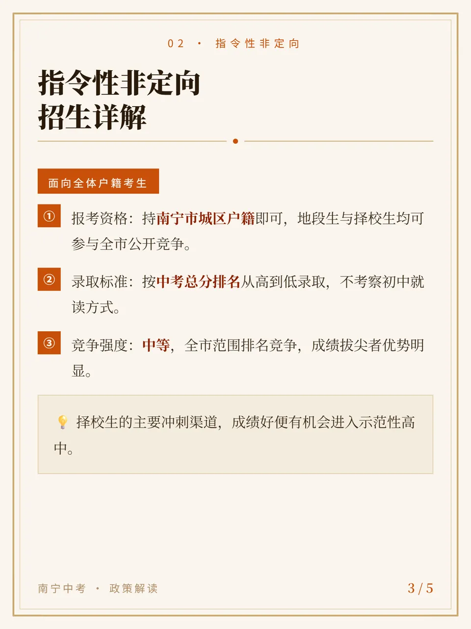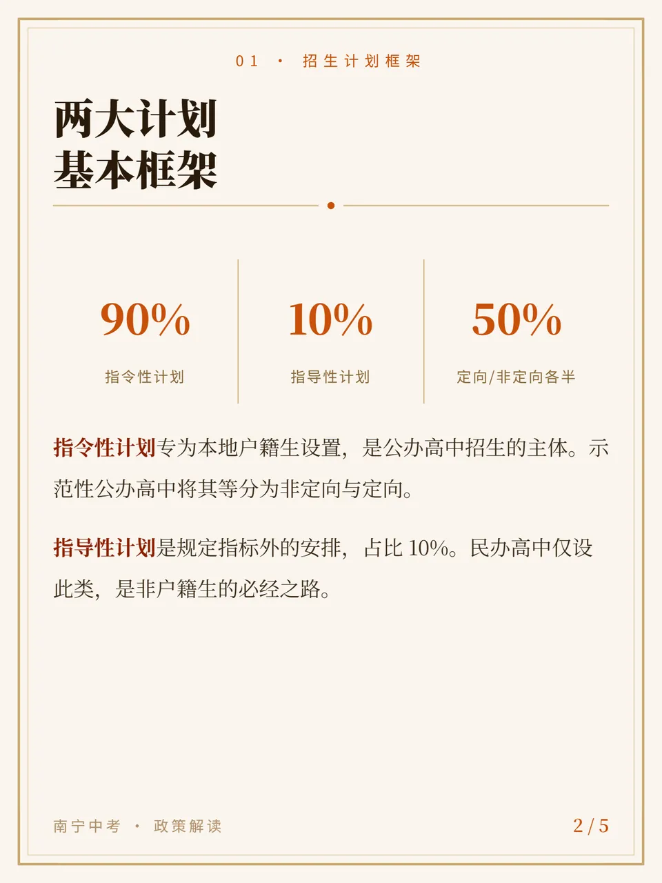 从宏观层面来看,指令性计划是南宁市专门为本地户籍学生设置的升学渠道,在公办高中招生总量中占据90%的份额。其中,示范性公办高中的指令性计划又细分为两类:指令性非定向和指令性定向,各占50%。而指导性计划则是在教育主管部门规定指标之外的招生安排,在公办高中招生中占比10%。值得注意的是,民办高中仅设置指导性计划。指令性非定向招生详解