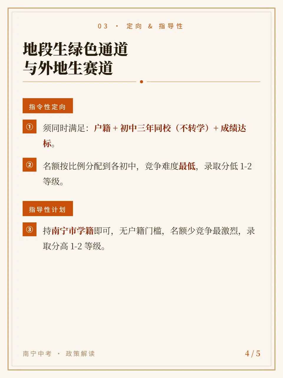 南宁中考的三类招生计划,本质上是根据户籍和学籍身份划分的不同升学通道。拥有户籍的地段生应优先冲刺指令性定向(竞争难度最低),非户籍生则只能参与指导性计划的竞争(同时要考虑民办高中作为保底选择)。但无论参与哪种类型的竞争,最终都是由成绩排名决定录取结果。家长和考生的备考建议