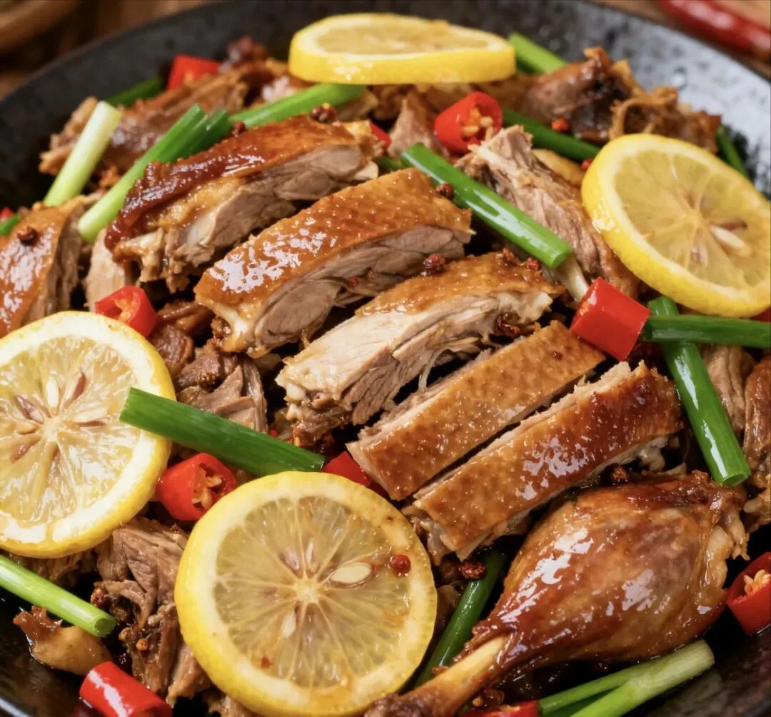 咸柠檬 + 酸姜 + 鸭肉爆炒,酸辣鲜香、不腥不腻,干捞饭一绝。鸭肉紧实入味,酸香直击味蕾,天热没胃口?吃它准没错,开胃又下饭。
