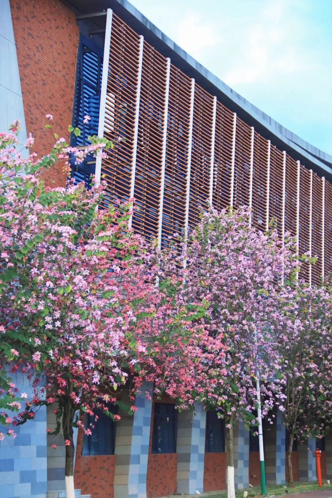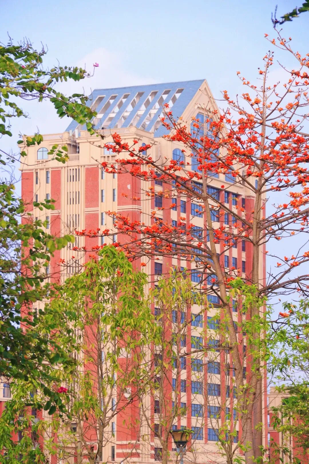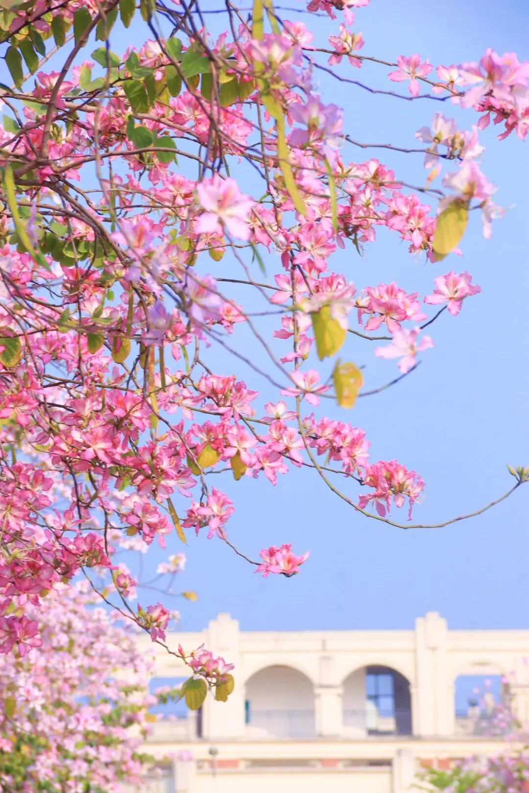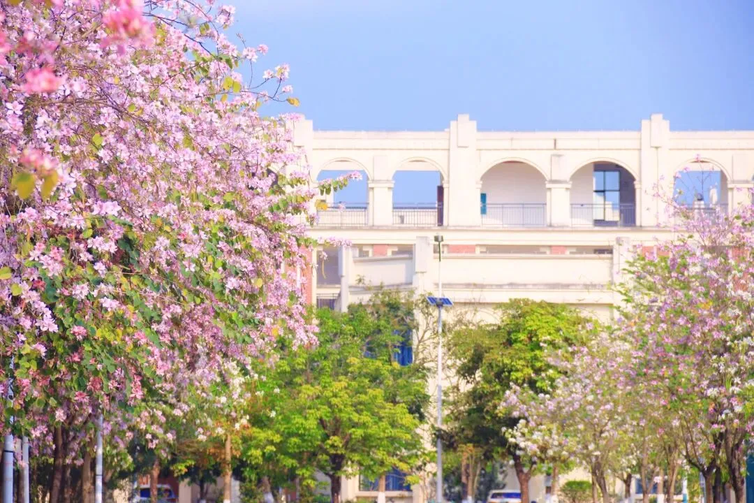 以前总觉得,春天得去南宁市区的公园才能找到。直到这个没课的下午,我扫上那辆2.9元一学期随便骑的青桔小单车,在校园里慢悠悠转了一圈,才真正体会到——原来从房子里走出来,就能站在春天中间。(这里必须要无广夸夸青桔,2.9元骑一个学期的骑行卡对学生党来说太实惠了!)平时上课、吃饭、回宿舍,三点一线的日子过得太匆忙。路过的花花草草,从来没认真看过。周末一有空,就想着往市区跑,总觉得外面的春天才好看,却忘了低头看看自己天天待的校园。体育馆旁的紫荆花开得正盛,粉紫色的一大片,风一吹就往下掉花瓣,走在树下像踩在花路上。偶尔路过几个骑着单车经过的同学,这不就是青春的样子吗?我慢慢走进漫天花簇里,风裹着淡淡的花香拂过发梢,指尖轻触柔软的花瓣,举起镜头,也怀着满心温柔,认真定格下它们一年里最明媚、最动人的盛放模样。教学楼旁的夹竹桃也悄然开了,粉白相间的小花朵挨挨挤挤,簇拥在翠绿的枝叶间,热热闹闹地绕着台阶层层铺开,风一吹,便轻轻摇曳,把春日的温柔都揉进了校园的角落。还有几棵木棉花特别扎眼,光秃秃的枝桠上挂满了橙红色的花,像一团团小火球,衬得宿舍楼很好看。沿路还看到一大片黄槐决明,叶子细细碎碎的,枝头开满小黄花,一丛一丛的,风一吹就轻轻摇,为校园的春色添了一抹明亮的暖黄。